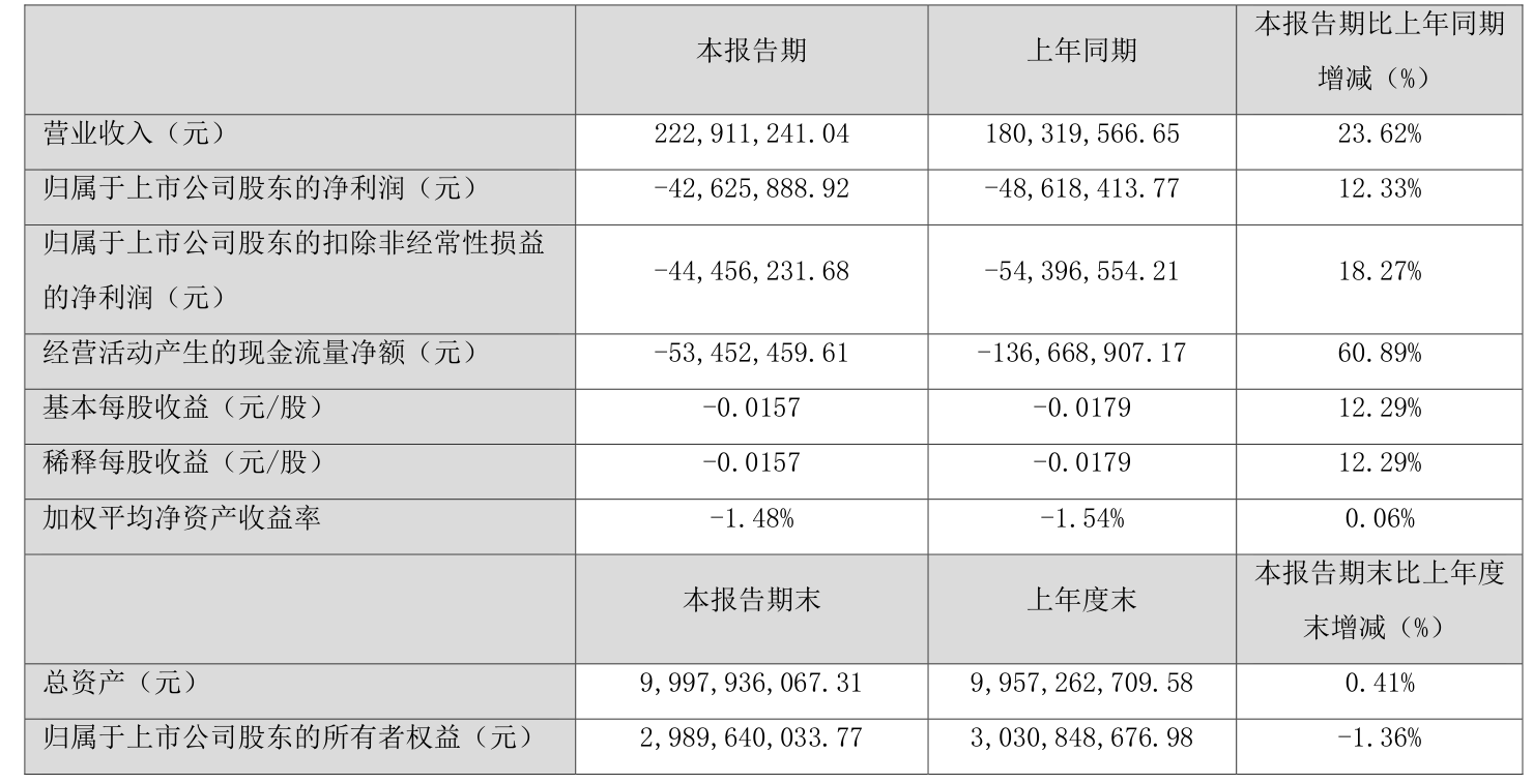 中证智能财讯神州高铁(000008)4月29日披露2025年第一季度报告。公司实现营业总收入2.23亿元,同比增长23.62%;归母净利润亏损4262.59万元,上年同期亏损4861.84万元;扣非净利润亏损4445.62万元,上年同期亏损5439.66万元;经营活动产生的现金流量净额为-5345.25万元,上年同期为-1.37亿元;报告期内,神州高铁基本每股收益为-0.0157元,加权平均净资产收益率为-1.48%。