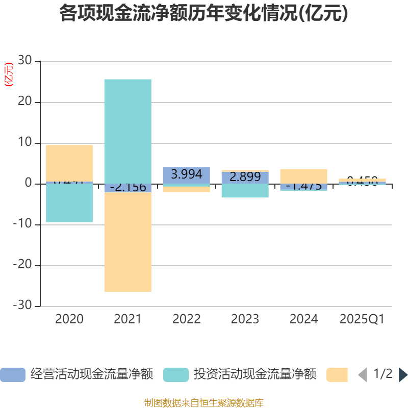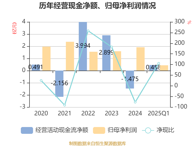 截至2025年一季度末,公司经营活动现金流净额为4581.17万元,同比增加4953.99万元;筹资活动现金流净额7615.05万元,同比减少3236.97万元;投资活动现金流净额-3732.61万元,上年同期为119.24万元。