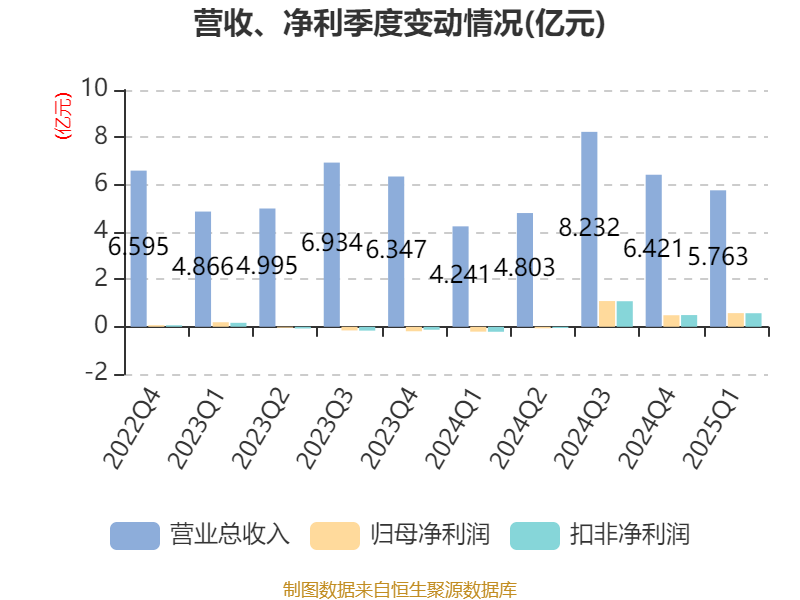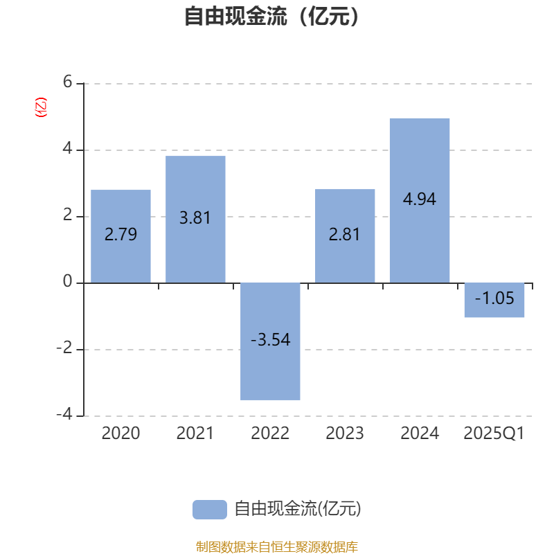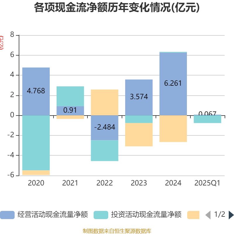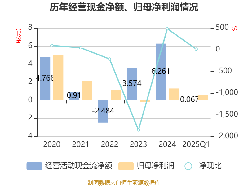 截至2025年一季度末,公司经营活动现金流净额为673.51万元,同比下降94.87%;筹资活动现金流净额-5.76万元,同比增加5140.19万元;投资活动现金流净额-7701.29万元,上年同期为-493.15万元。