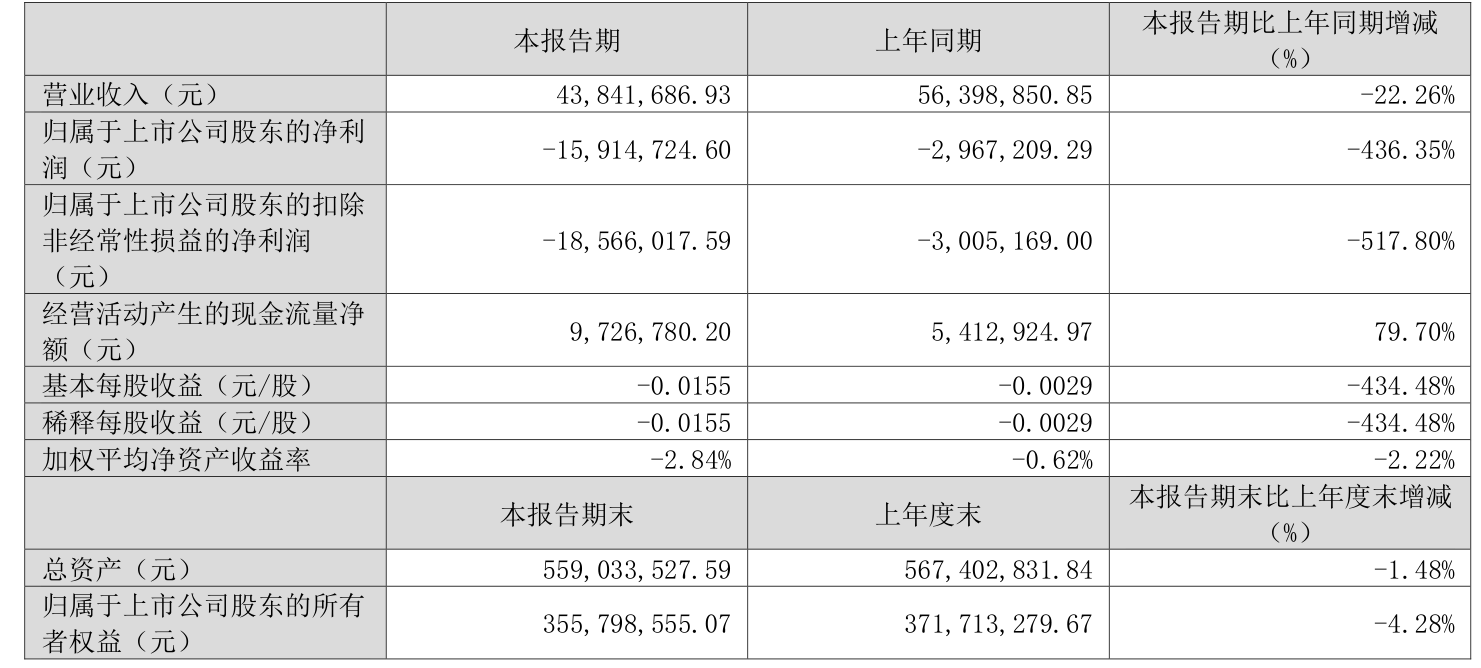 中证智能财讯*ST四环(维权)(000518)4月30日披露2025年第一季度报告。公司实现营业总收入4384.17万元,同比下降22.26%;归母净利润亏损1591.47万元,上年同期亏损296.72万元;扣非净利润亏损1856.6万元,上年同期亏损300.52万元;经营活动产生的现金流量净额为972.68万元,同比增长79.70%;报告期内,*ST四环基本每股收益为-0.0155元,加权平均净资产收益率为-2.84%。