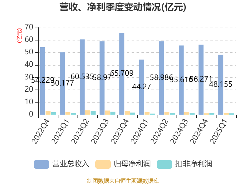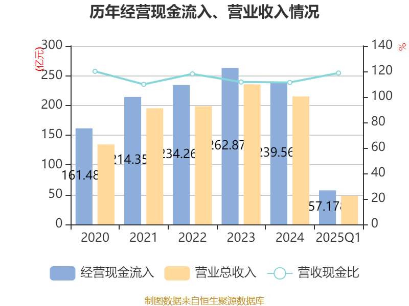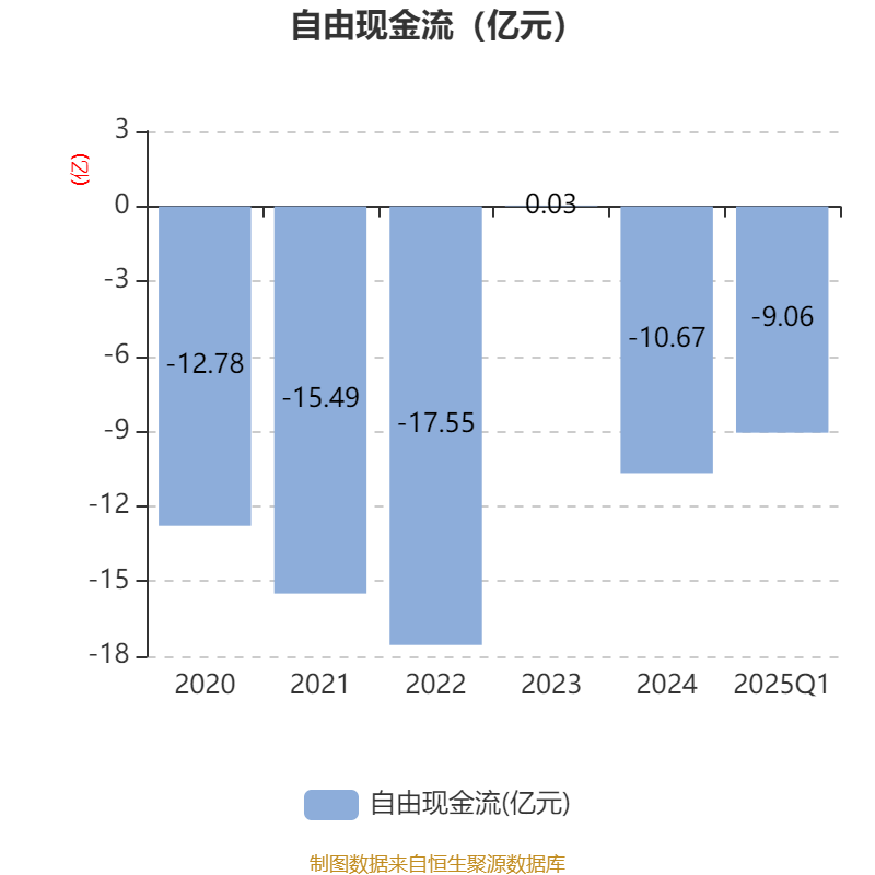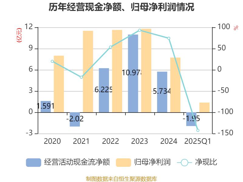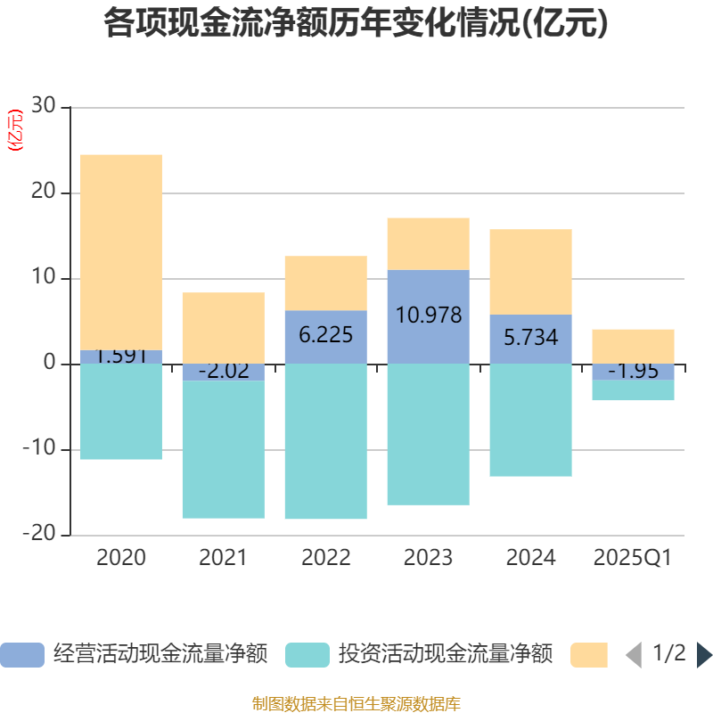 截至2025年一季度末,公司经营活动现金流净额为-1.95亿元,同比减少2.79亿元;筹资活动现金流净额3.99亿元,同比增加9681.79万元;投资活动现金流净额-2.32亿元,上年同期为-3.07亿元。