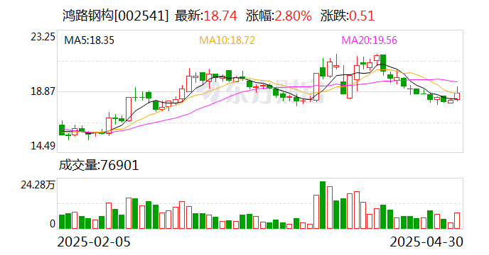 中证智能财讯鸿路钢构(002541)4月30日披露2025年第一季度报告。公司实现营业总收入48.15亿元,同比增长8.78%;归母净利润1.37亿元,同比下降32.78%;扣非净利润1.15亿元,同比增长31.27%;经营活动产生的现金流量净额为-1.95亿元,上年同期为8421.14万元;报告期内,鸿路钢构基本每股收益为0.1987元,加权平均净资产收益率为1.41%。