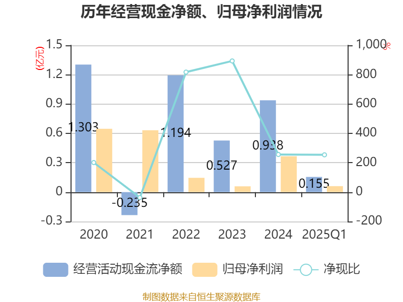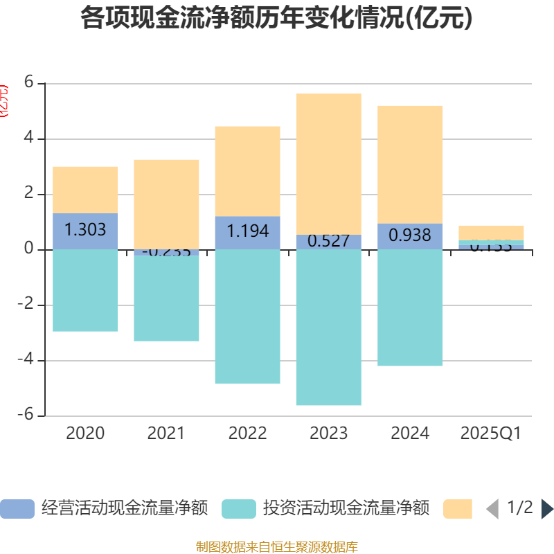 截至2025年一季度末,公司经营活动现金流净额为1552.71万元,同比增长545.49%;筹资活动现金流净额5200.63万元,同比减少8602.98万元;投资活动现金流净额1759.46万元,上年同期为-7025.18万元。