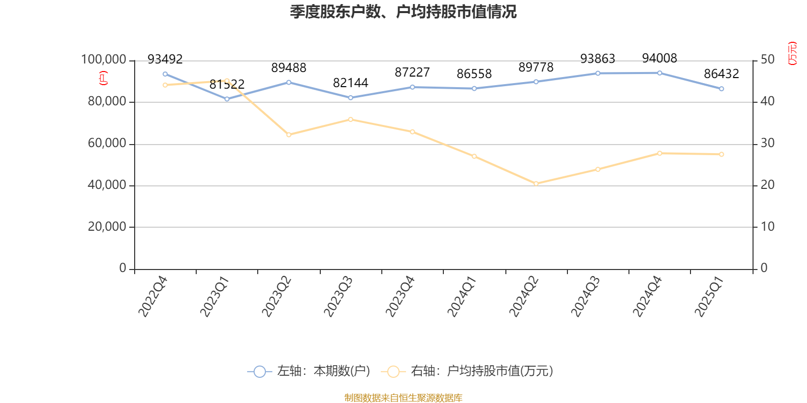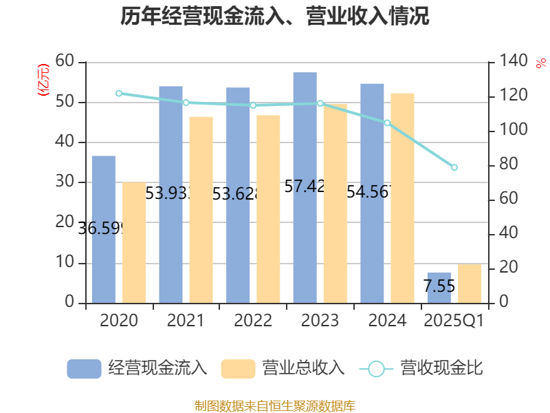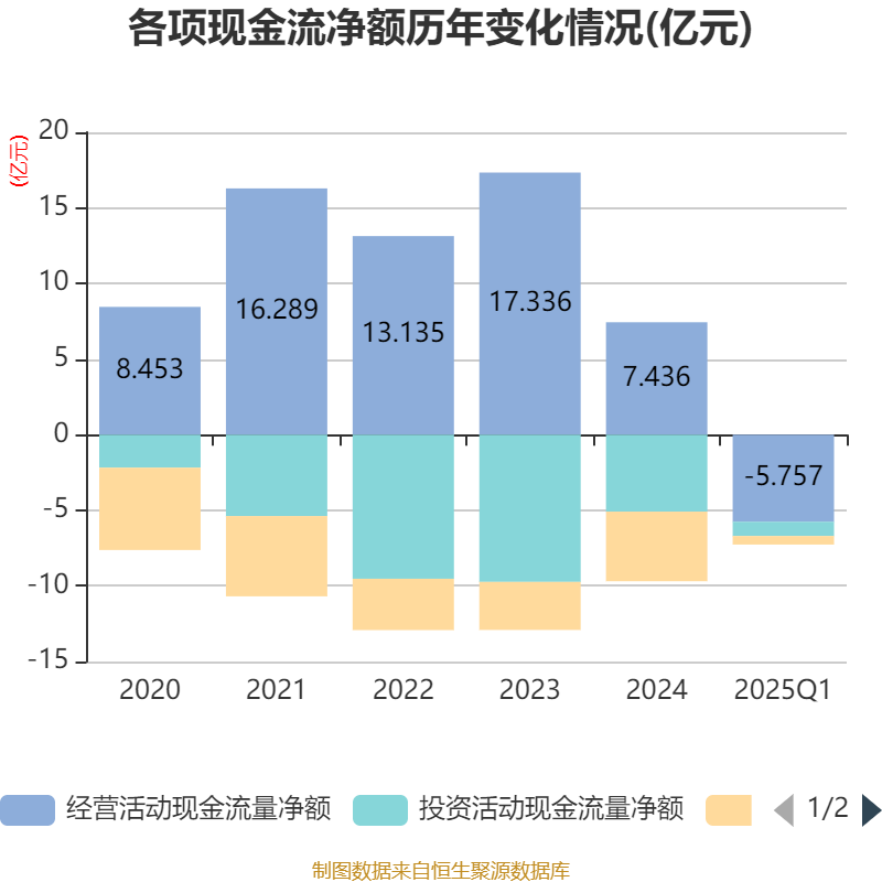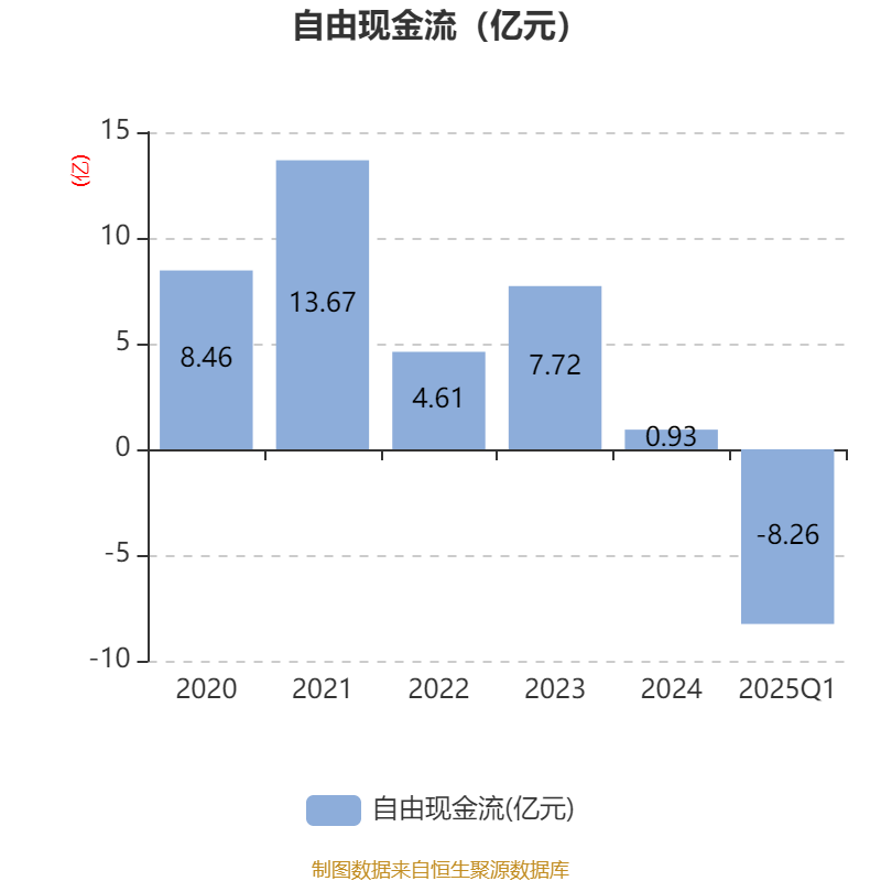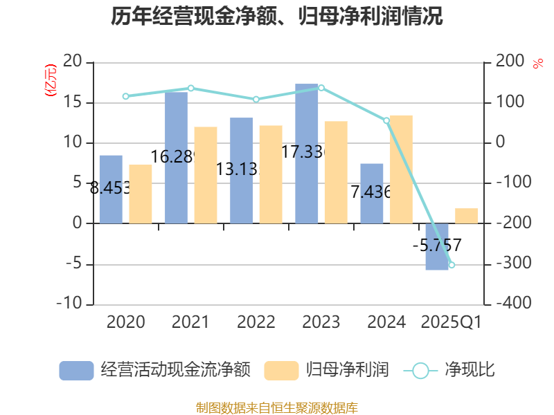 截至2025年一季度末,公司经营活动现金流净额为-5.76亿元,同比减少4.73亿元;筹资活动现金流净额-5665.69万元,同比增加1968.2万元;投资活动现金流净额-9423.75万元,上年同期为-2.06亿元。