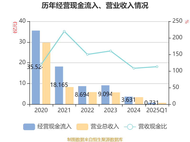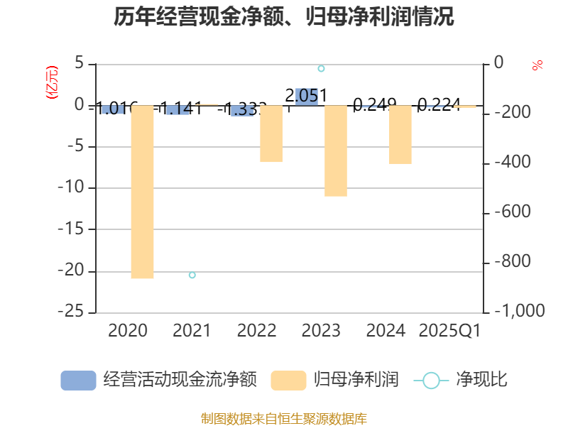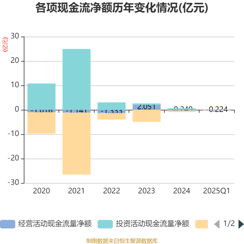 截至2025年一季度末,公司经营活动现金流净额为-2241.11万元,同比减少919.27万元;筹资活动现金流净额1981.4万元,同比增加3048.86万元;投资活动现金流净额-309.99万元,上年同期为902.7万元。