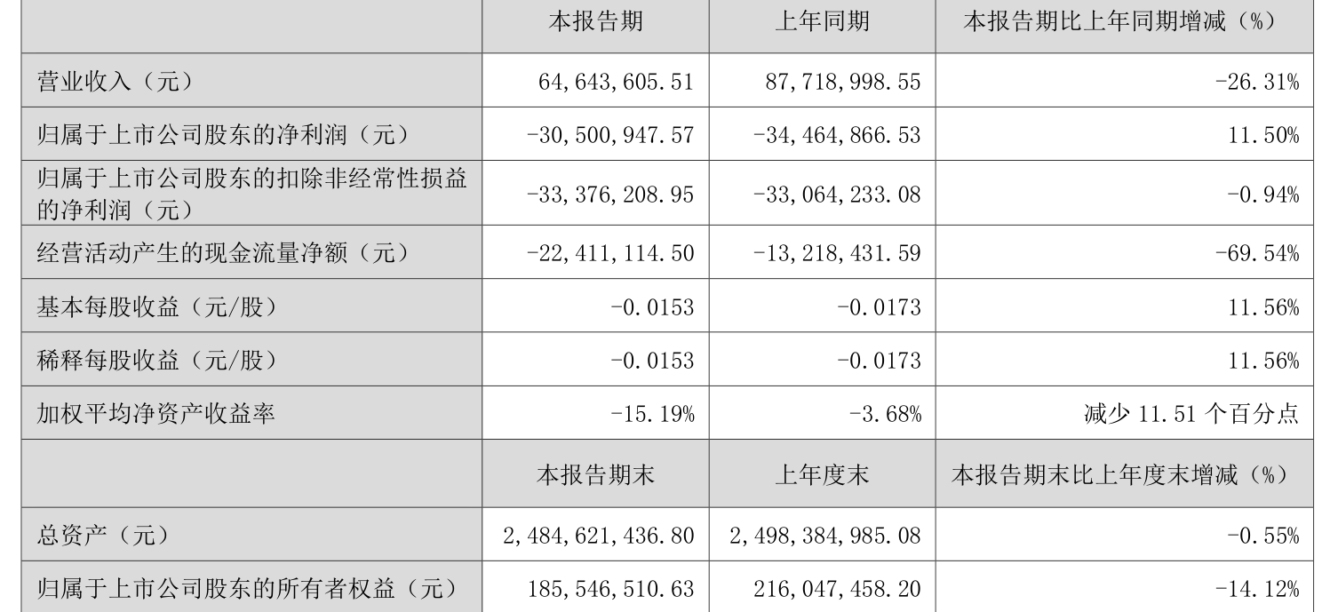 中证智能财讯ST华闻(维权)(000793)4月30日披露2025年第一季度报告。公司实现营业总收入6464.36万元,同比下降26.31%;归母净利润亏损3050.09万元,上年同期亏损3446.49万元;扣非净利润亏损3337.62万元,上年同期亏损3306.42万元;经营活动产生的现金流量净额为-2241.11万元,上年同期为-1321.84万元;报告期内,ST华闻基本每股收益为-0.0153元,加权平均净资产收益率为-15.19%。