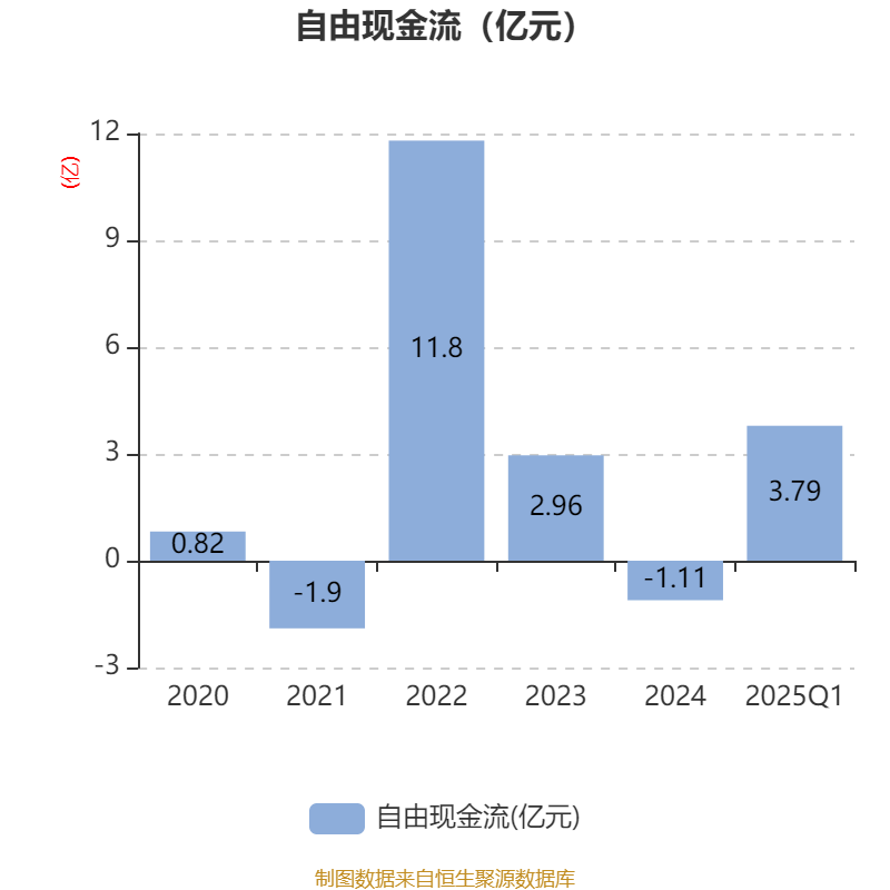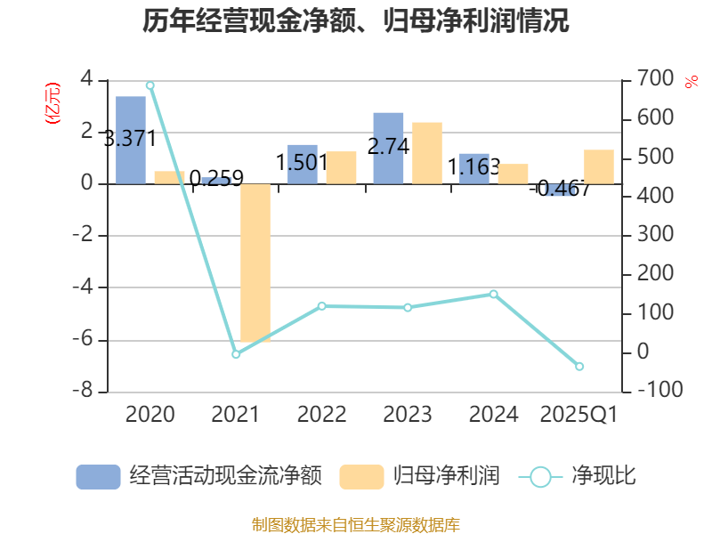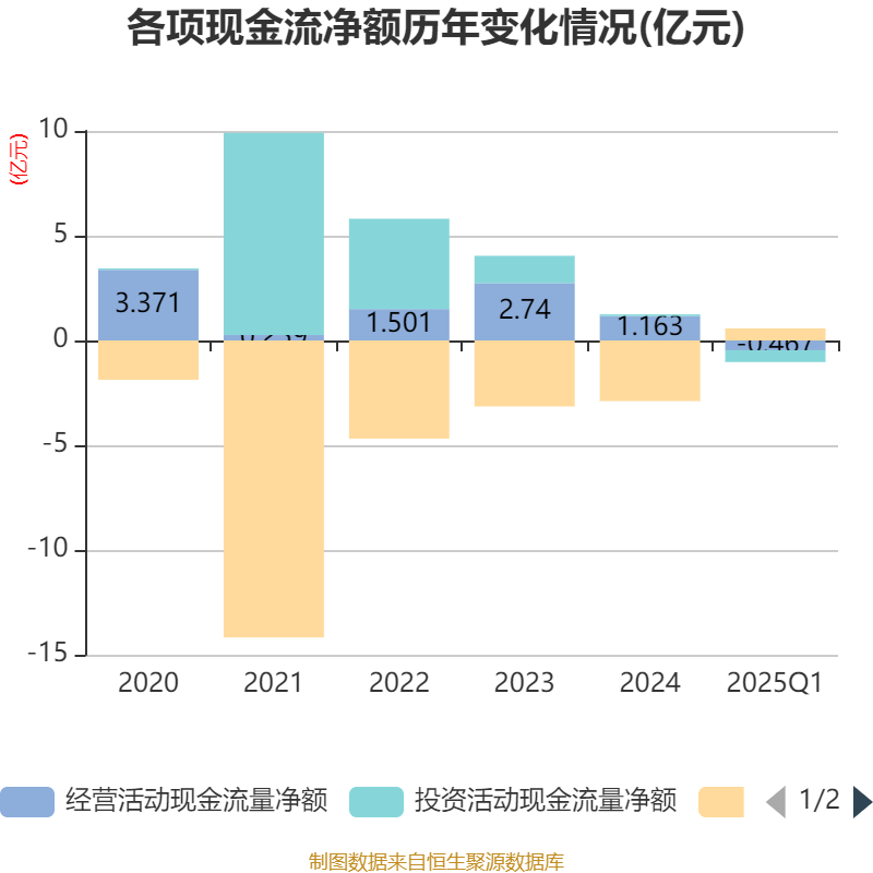 截至2025年一季度末,公司经营活动现金流净额为-4667.9万元,同比增加3696.66万元;筹资活动现金流净额5757.97万元,同比增加3058.18万元;投资活动现金流净额-5642万元,上年同期为-5259.93万元。