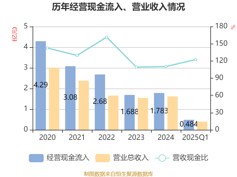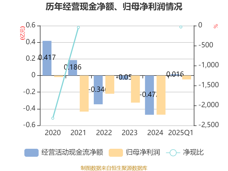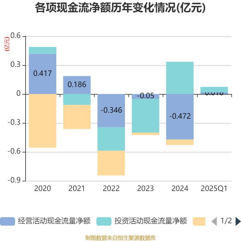 截至2025年一季度末,公司经营活动现金流净额为159.2万元,同比增长6.73%;筹资活动现金流净额0元,与同期相比基本不变;投资活动现金流净额576.06万元,上年同期为-183.46万元。