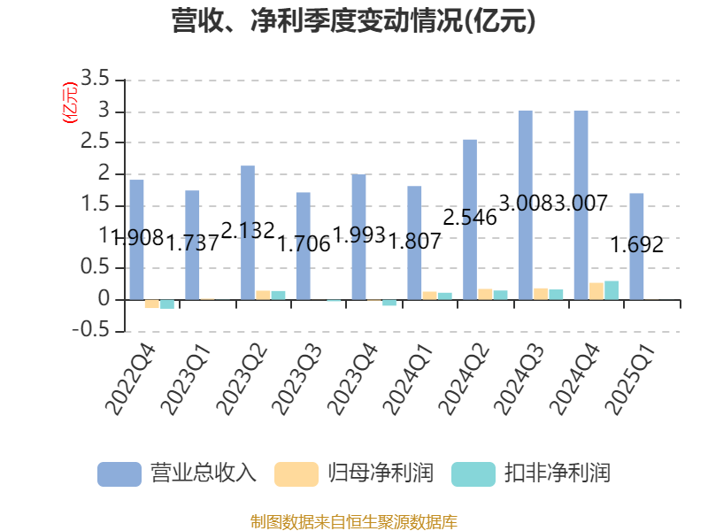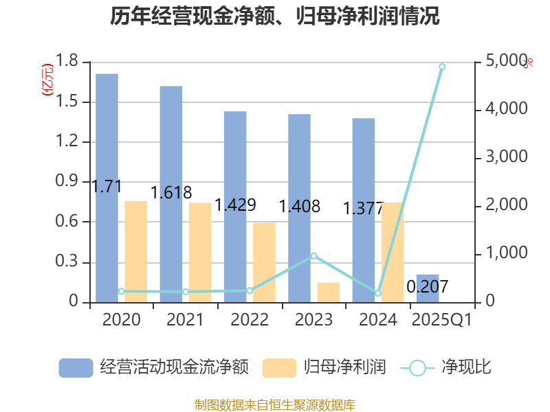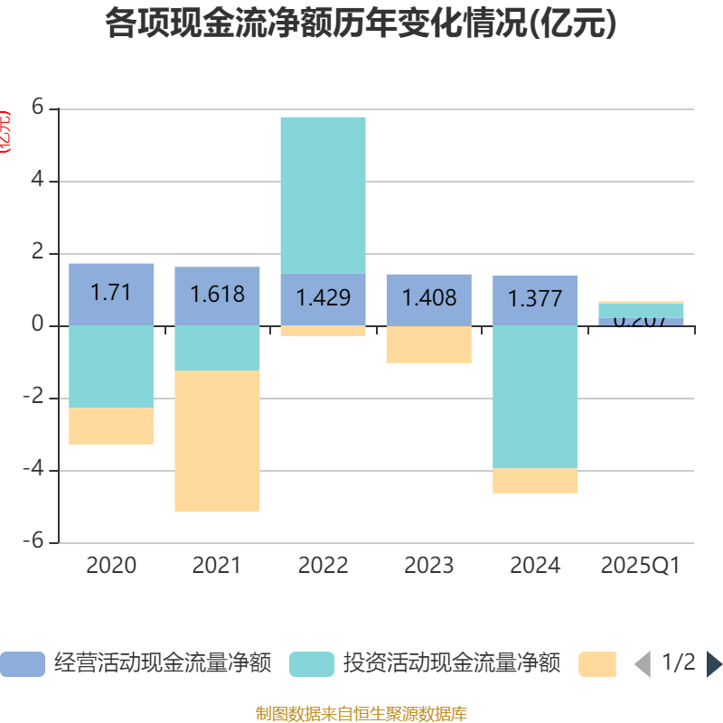 截至2025年一季度末,公司经营活动现金流净额为2070.99万元,同比增长53.26%;筹资活动现金流净额610.93万元,同比增加1888.21万元;投资活动现金流净额3998.39万元,上年同期为-5992.05万元。