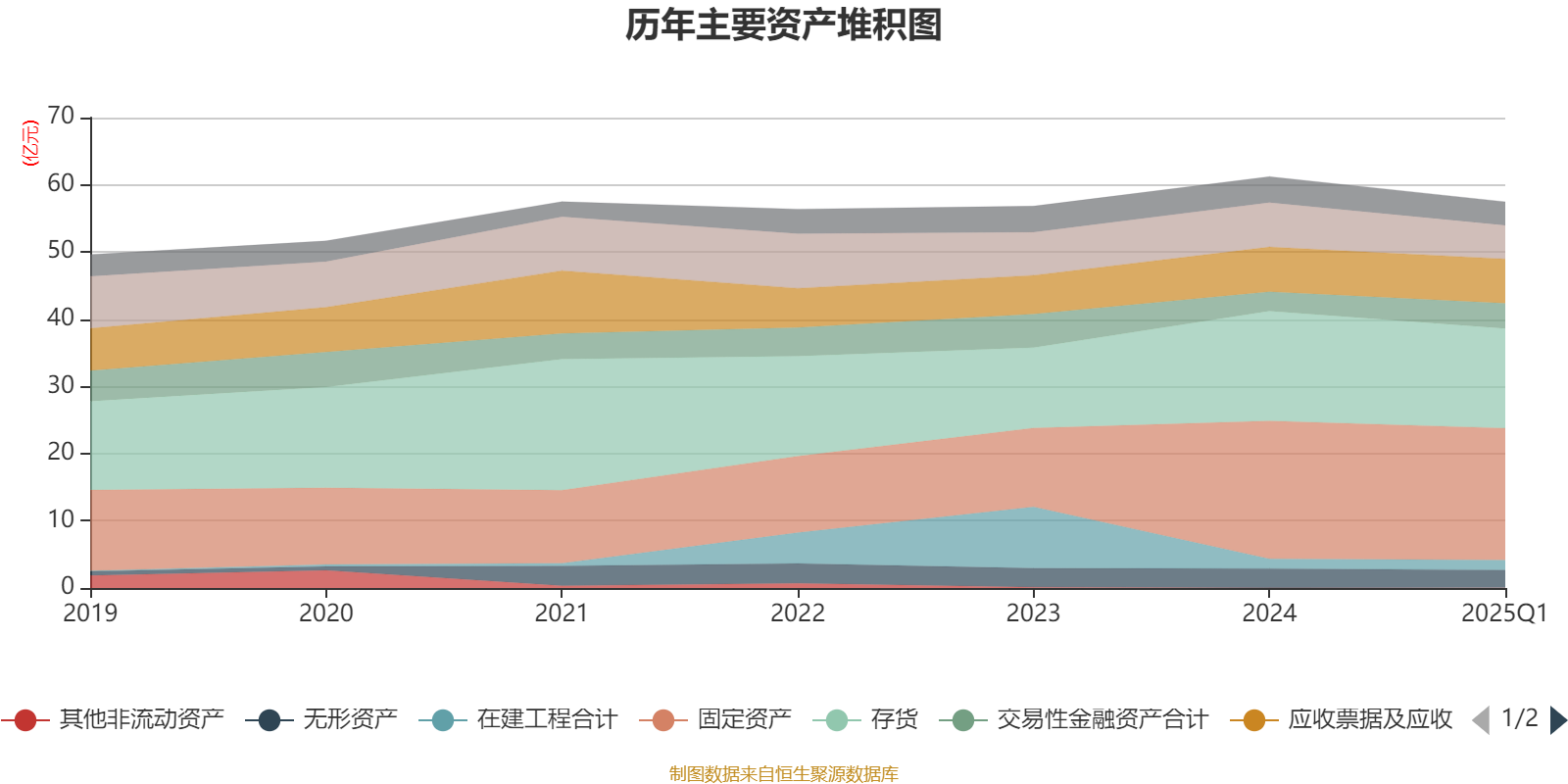 资产重大变化方面,截至2025年一季度末,公司货币资金较上年末减少24.13%,占公司总资产比重下降2.07个百分点;交易性金融资产合计较上年末增加30.43%,占公司总资产比重上升1.83个百分点;存货较上年末减少9.29%,占公司总资产比重下降0.9个百分点;固定资产较上年末减少4.27%,占公司总资产比重上升0.66个百分点。