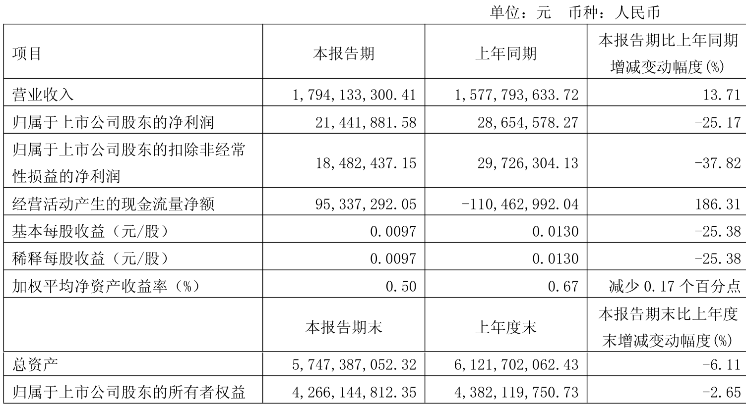 中证智能财讯怡球资源(601388)4月29日披露2025年第一季度报告。公司实现营业总收入17.94亿元,同比增长13.71%;归母净利润2144.19万元,同比下降25.17%;扣非净利润1848.24万元,同比下降37.82%;经营活动产生的现金流量净额为9533.73万元,上年同期为-1.1亿元;报告期内,怡球资源基本每股收益为0.0097元,加权平均净资产收益率为0.50%。