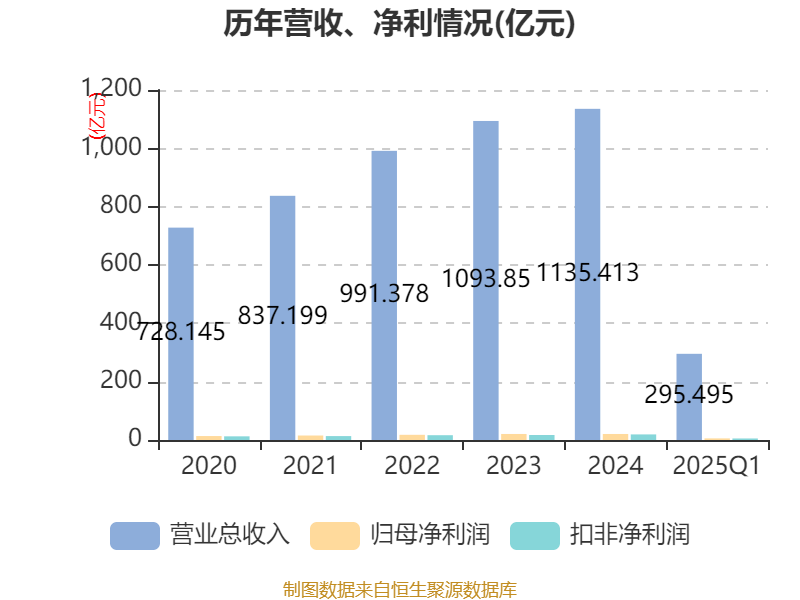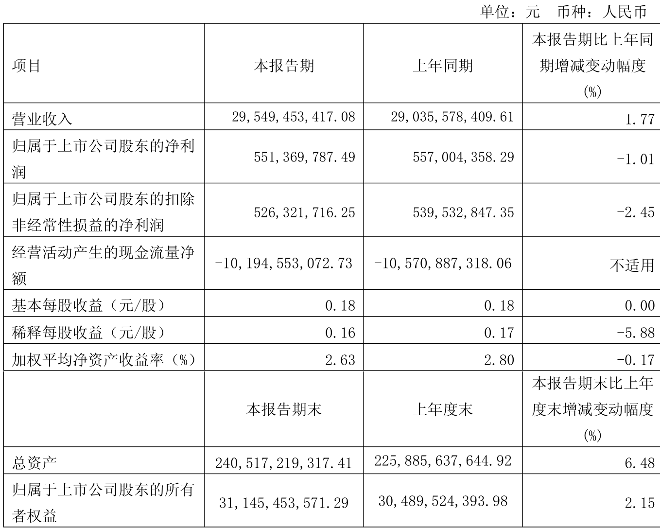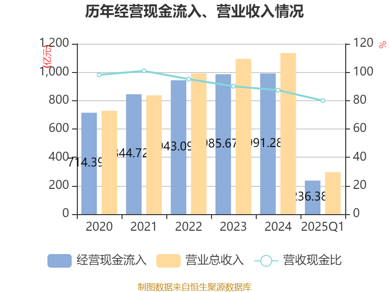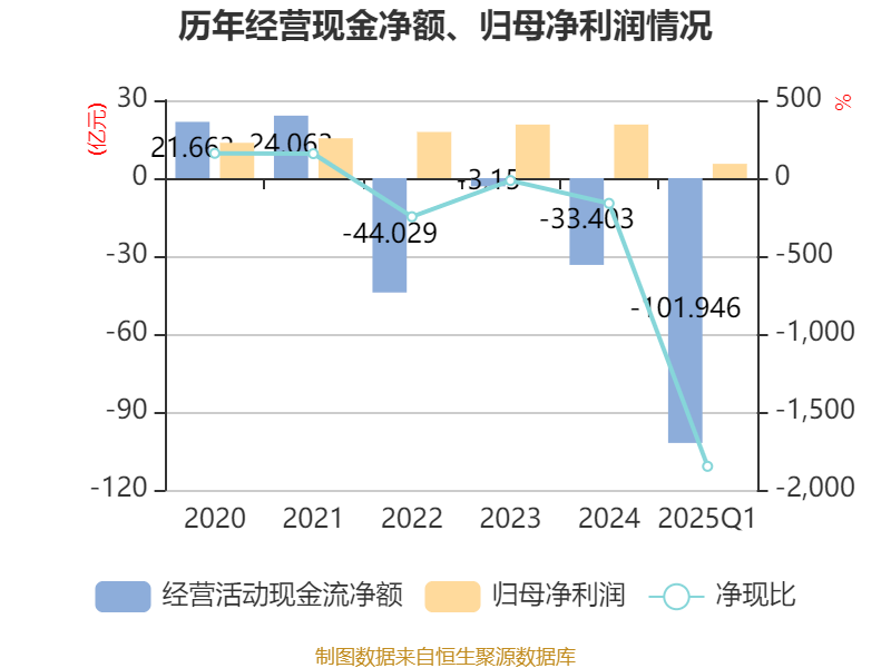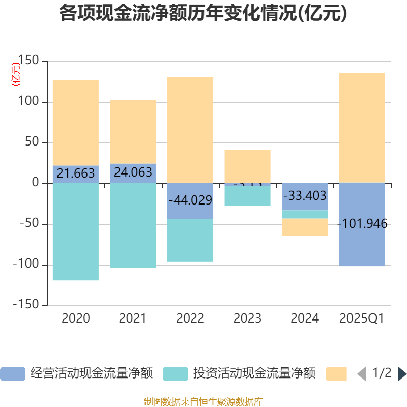 截至2025年一季度末,公司经营活动现金流净额为-101.95亿元,同比增加3.76亿元;筹资活动现金流净额134.11亿元,同比增加73.71亿元;投资活动现金流净额9341.76万元,上年同期为-4.27亿元。