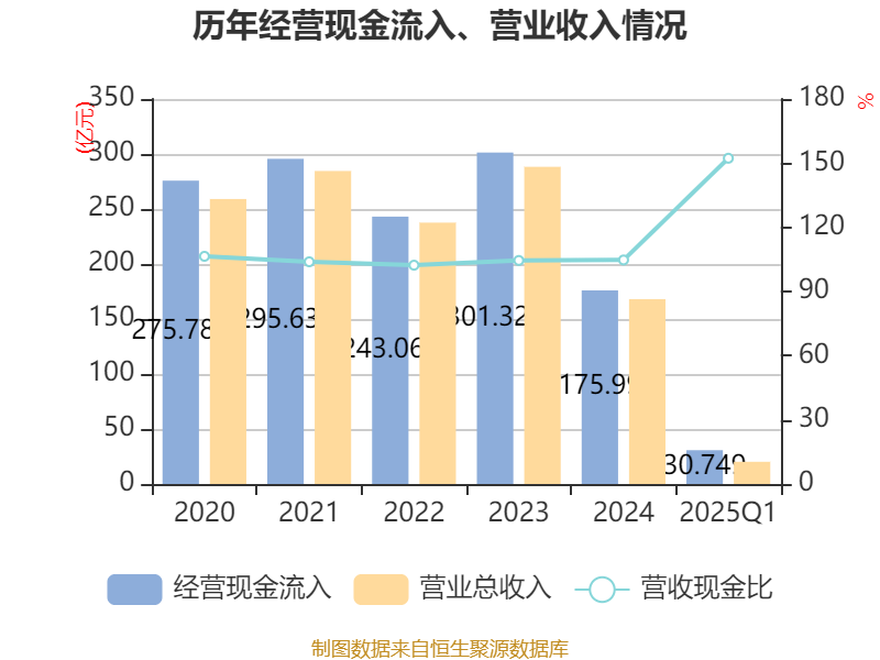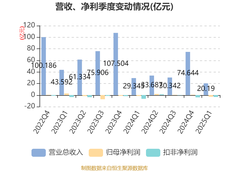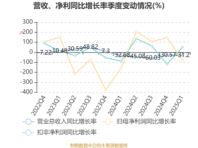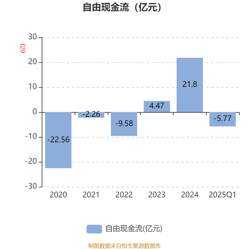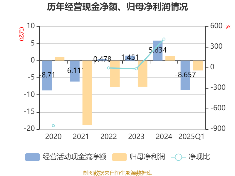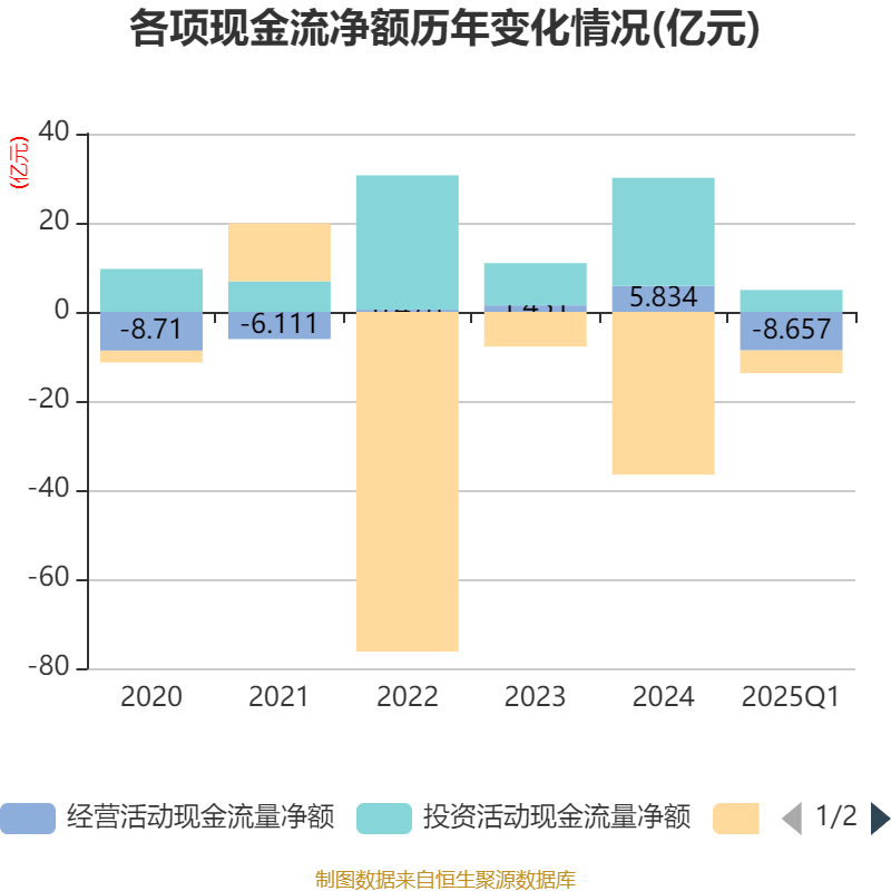 截至2025年一季度末,公司经营活动现金流净额为-8.66亿元,同比增加4.72亿元;筹资活动现金流净额-5.1亿元,同比增加9.67亿元;投资活动现金流净额4.9亿元,上年同期为12.29亿元。
