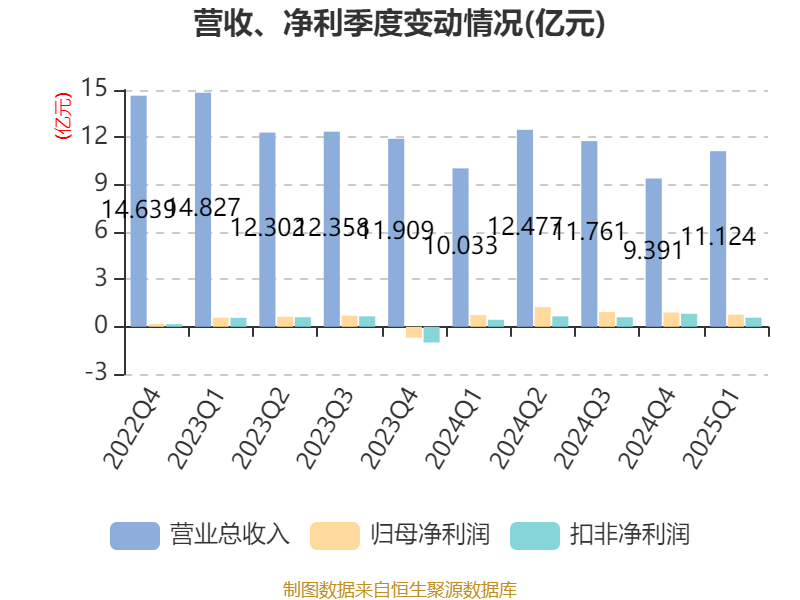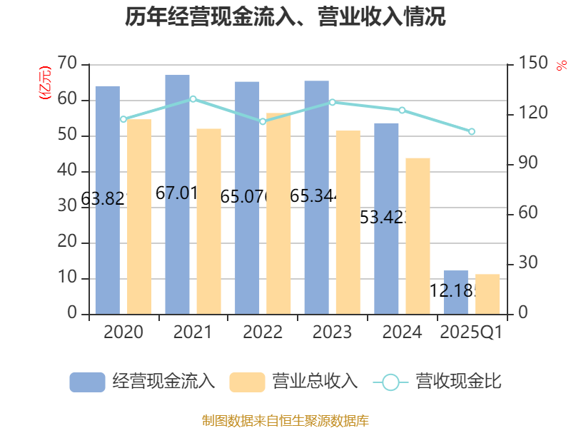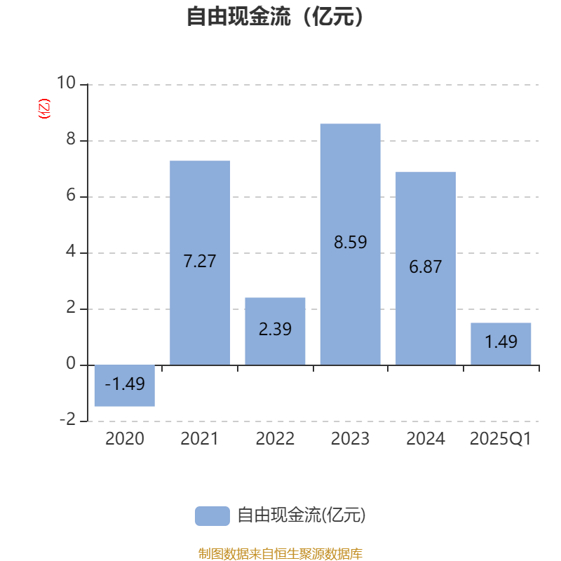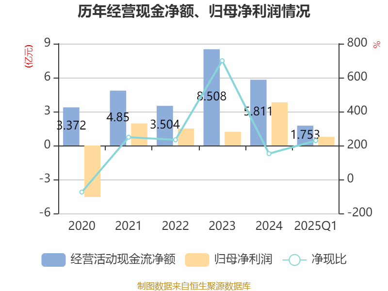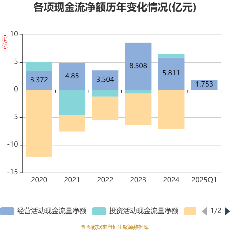 截至2025年一季度末,公司经营活动现金流净额为1.75亿元,同比下降1.55%;筹资活动现金流净额0元,同比增加650.71万元;投资活动现金流净额-750.48万元,上年同期为-5702.57万元。