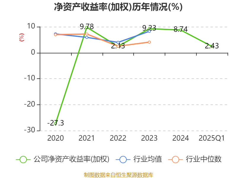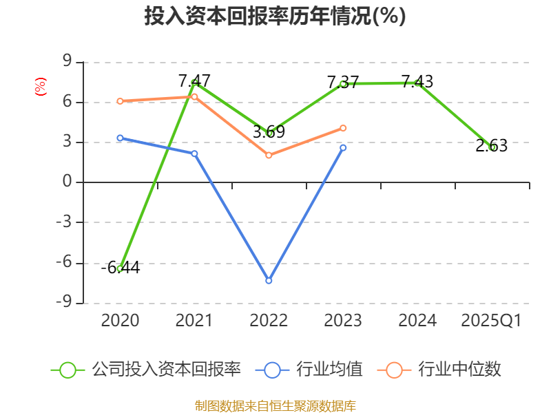 盈利能力方面, 2025年一季度公司加权平均净资产收益率为2.43%,同比下降0.93个百分点。公司2025年第一季度投入资本回报率为2.63%,较上年同期下降0.05个百分点。