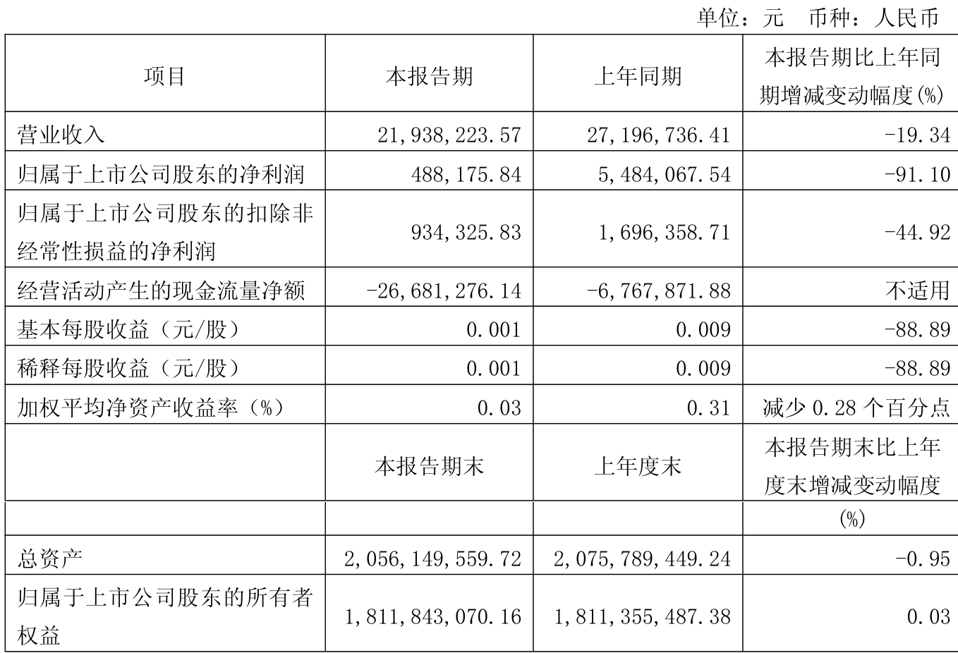 中证智能财讯中国高科(600730)4月30日披露2025年第一季度报告。公司实现营业总收入2193.82万元,同比下降19.34%;归母净利润48.82万元,同比下降91.10%;扣非净利润93.43万元,同比下降44.92%;经营活动产生的现金流量净额为-2668.13万元,上年同期为-676.79万元;报告期内,中国高科基本每股收益为0.001元,加权平均净资产收益率为0.03%。