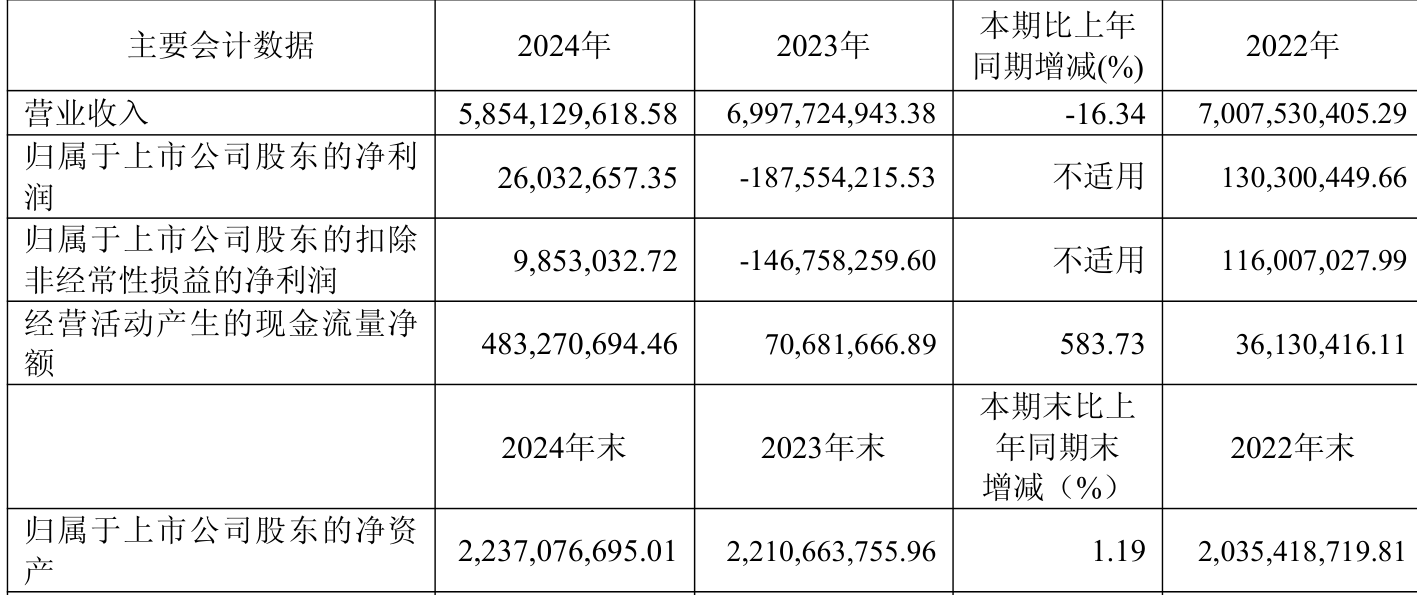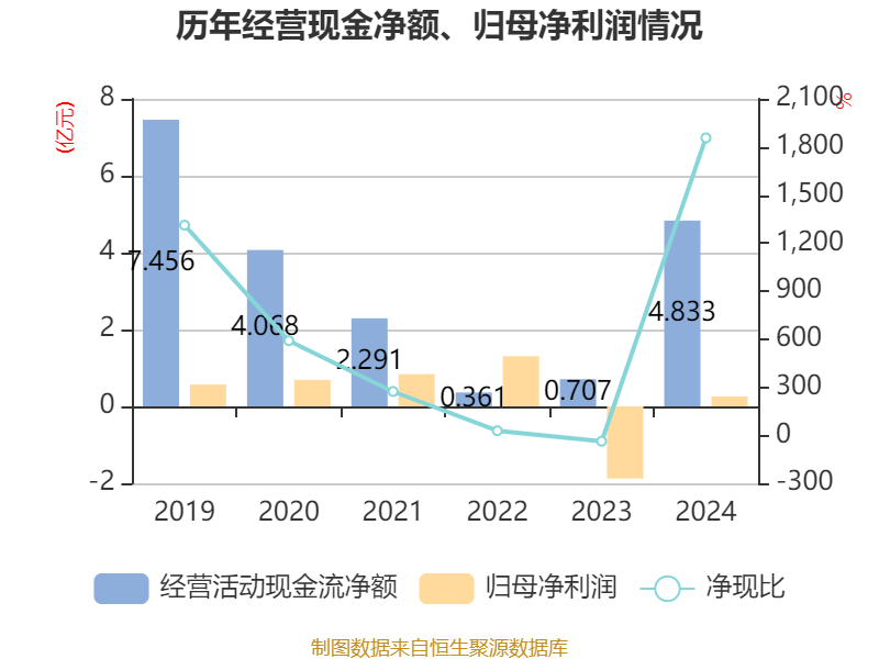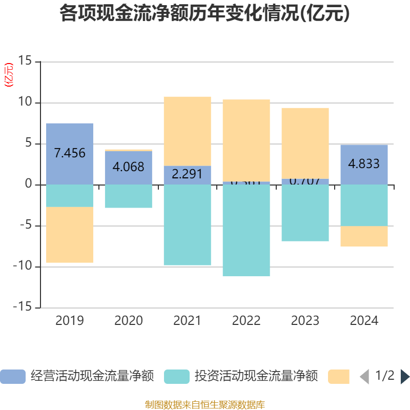 截至2024年,公司经营活动现金流净额为4.83亿元,同比增长583.73%;筹资活动现金流净额-2.48亿元,同比减少11.1亿元;投资活动现金流净额-5.08亿元,上年同期为-6.92亿元。