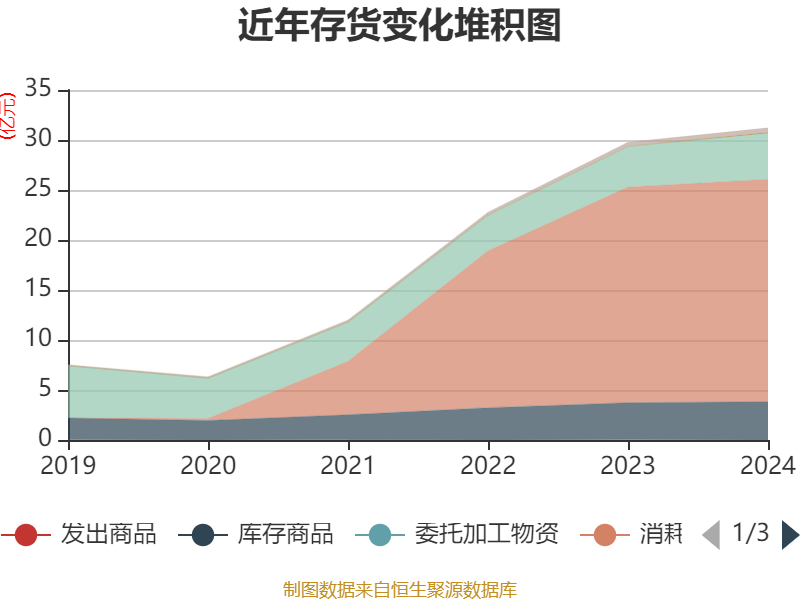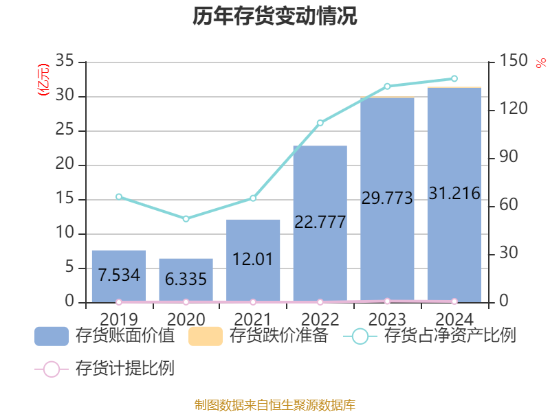 从存货变动来看,截至2024年末,公司存货账面价值为31.22亿元,占净资产的139.54%,较上年末增加1.44亿元。其中,存货跌价准备为1415.54万元,计提比例为0.45%。