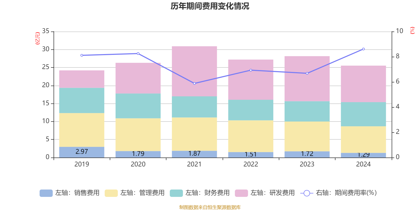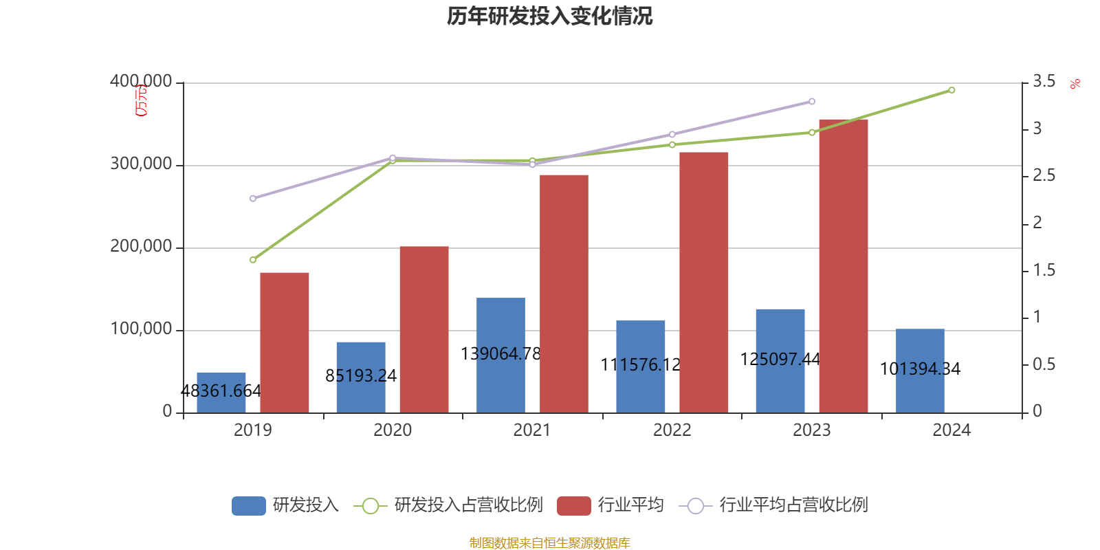 2024年全年,公司研发投入金额为10.14亿元,同比下降18.95%;研发投入占营业收入比例为3.42%,相比上年同期上升0.45个百分点。此外,公司全年研发投入资本化率为0%。
