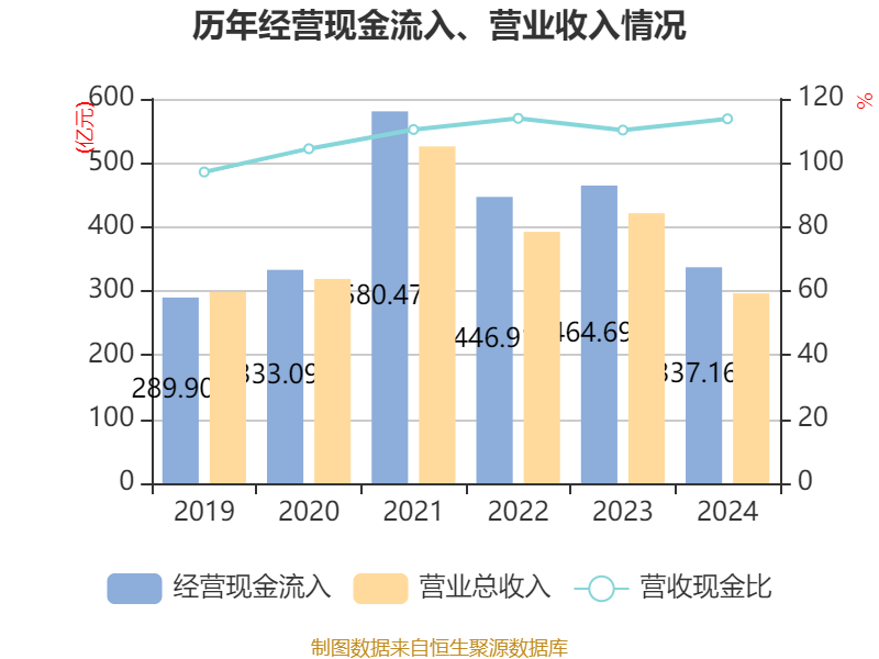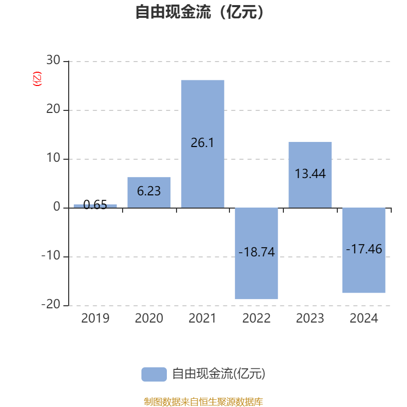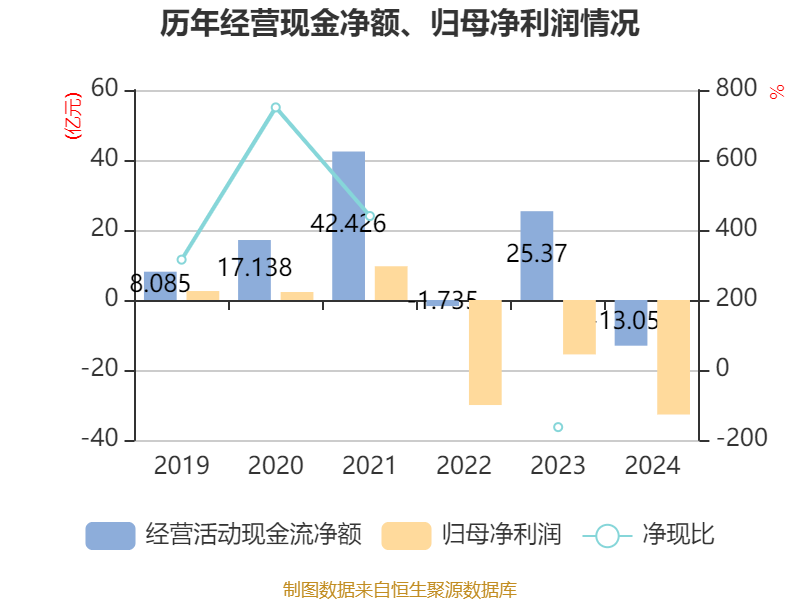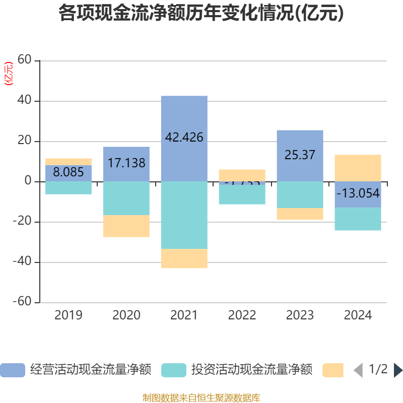 截至2024年,公司经营活动现金流净额为-13.05亿元,同比减少38.42亿元;筹资活动现金流净额13.19亿元,同比增加18.99亿元;投资活动现金流净额-11.32亿元,上年同期为-13.25亿元。