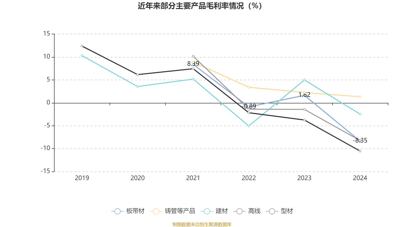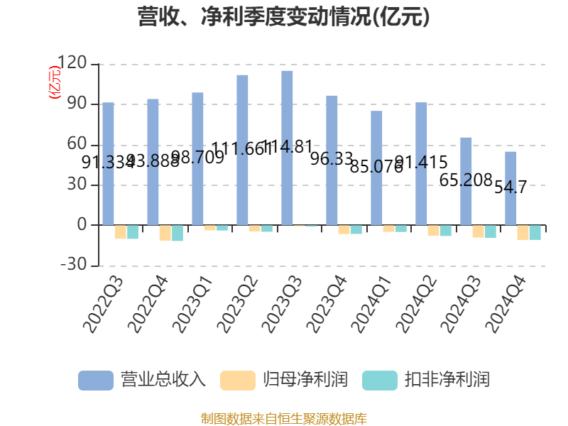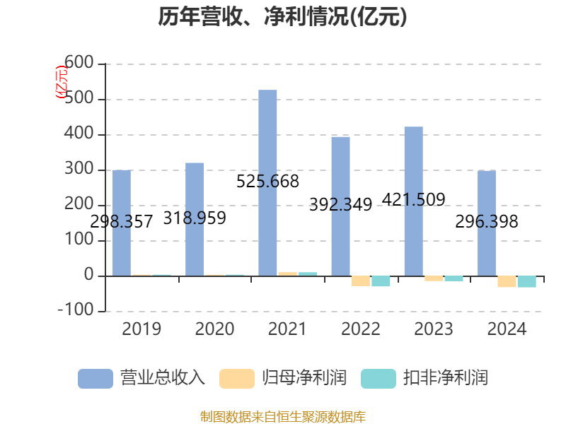 中证智能财讯安阳钢铁(600569)4月30日披露2024年年度报告。2024年,公司实现营业总收入296.4亿元,同比下降29.68%;归母净利润亏损32.71亿元,上年同期亏损15.54亿元;扣非净利润亏损33.16亿元,上年同期亏损15.99亿元;经营活动产生的现金流量净额为-13.05亿元,上年同期为25.37亿元;报告期内,安阳钢铁基本每股收益为-1.139元,加权平均净资产收益率为-76.38%。