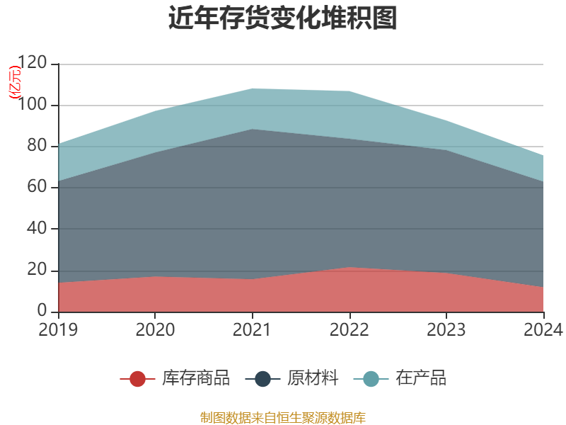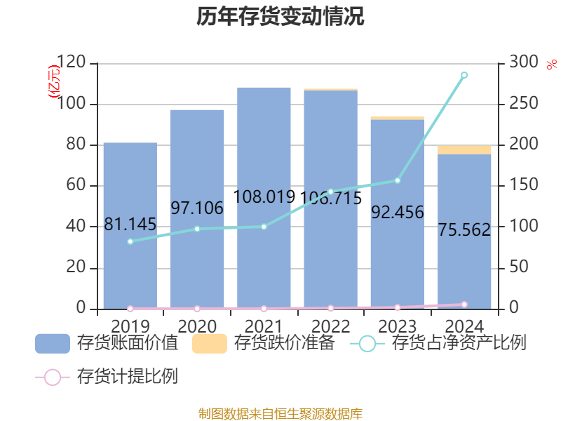 从存货变动来看,截至2024年末,公司存货账面价值为75.56亿元,占净资产的285.43%,较上年末减少16.89亿元。其中,存货跌价准备为4.12亿元,计提比例为5.17%。