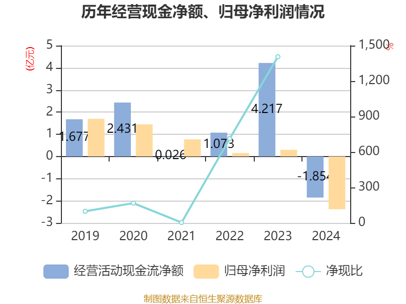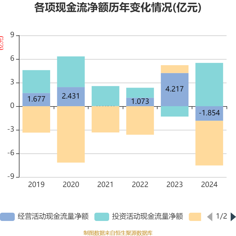 截至2024年,公司经营活动现金流净额为-1.85亿元,同比减少6.07亿元;筹资活动现金流净额-5.68亿元,同比减少6.68亿元;投资活动现金流净额5.51亿元,上年同期为-1.32亿元。