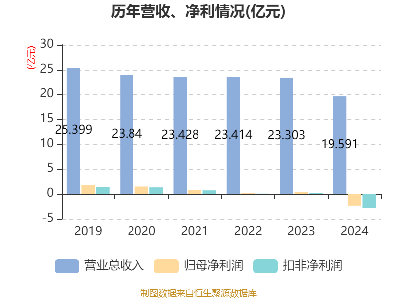 中证智能财讯红豆股份(600400)4月30日披露2024年年度报告。2024年,公司实现营业总收入19.59亿元,同比下降15.93%;归母净利润亏损2.38亿元,上年同期盈利3000.56万元;扣非净利润亏损2.85亿元,上年同期盈利1154.39万元;经营活动产生的现金流量净额为-1.85亿元,上年同期为4.22亿元;报告期内,红豆股份基本每股收益为-0.1元,加权平均净资产收益率为-8.49%。