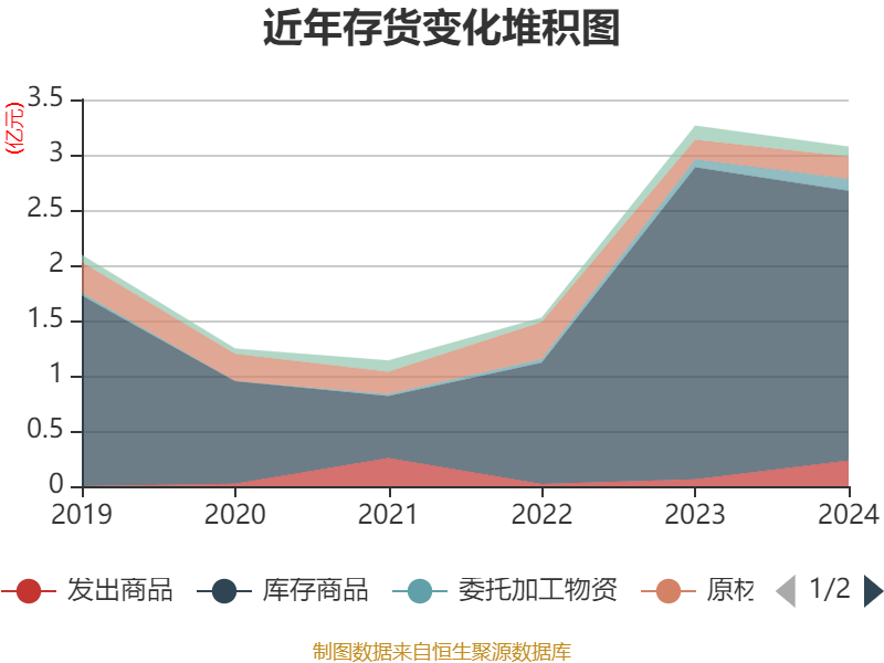 从存货变动来看,截至2024年末,公司存货账面价值为3.07亿元,占净资产的12.08%,较上年末减少1904.49万元。其中,存货跌价准备为4468.46万元,计提比例为12.7%。