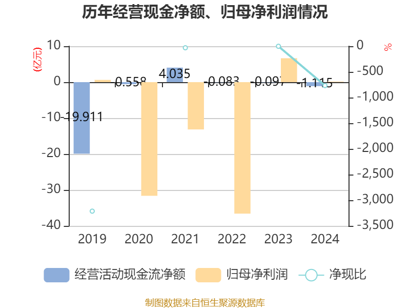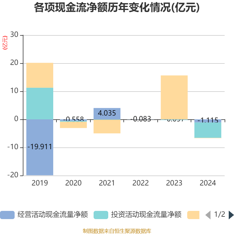 截至2024年,公司经营活动现金流净额为-1.12亿元,同比减少1.02亿元;筹资活动现金流净额-1110.01万元,同比减少15.75亿元;投资活动现金流净额-5.49亿元,上年同期为-1574.11万元。