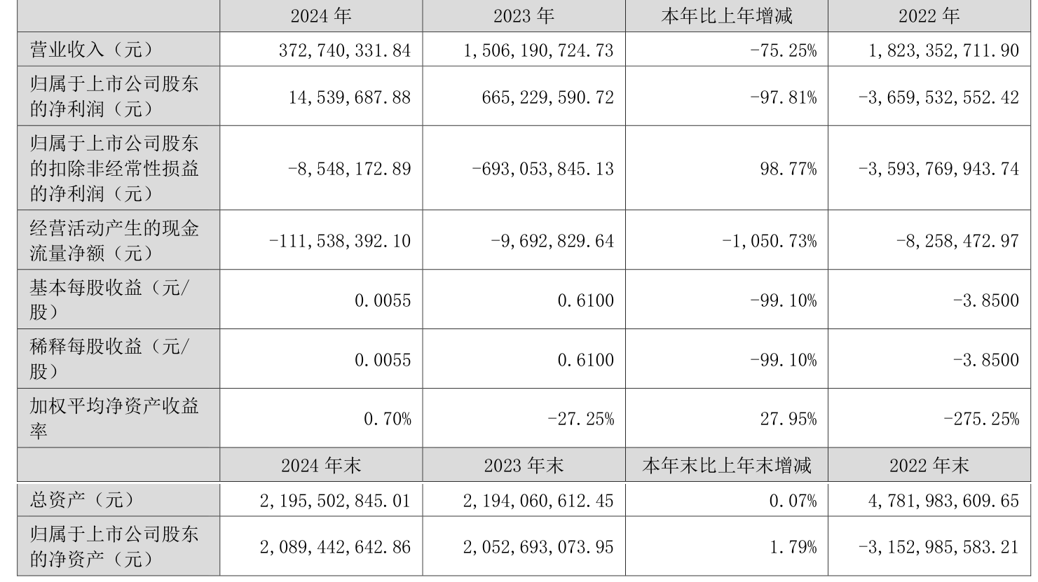 中证智能财讯ST金一(维权)(002721)4月29日披露2024年年度报告。2024年,公司实现营业总收入3.73亿元,同比下降75.25%;归母净利润1453.97万元,同比下降97.81%;扣非净利润亏损854.82万元,上年同期亏损6.93亿元;经营活动产生的现金流量净额为-1.12亿元,上年同期为-969.28万元;报告期内,ST金一基本每股收益为0.0055元,加权平均净资产收益率为0.70%。