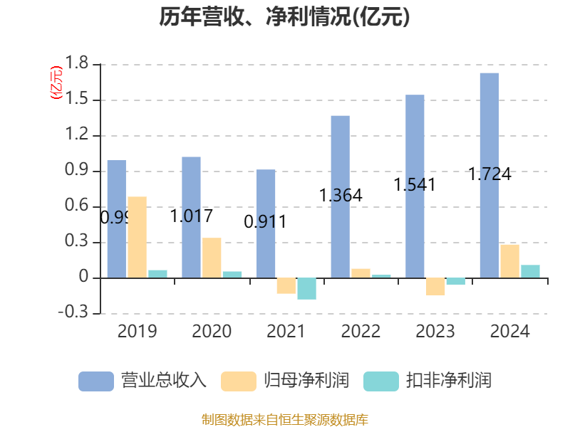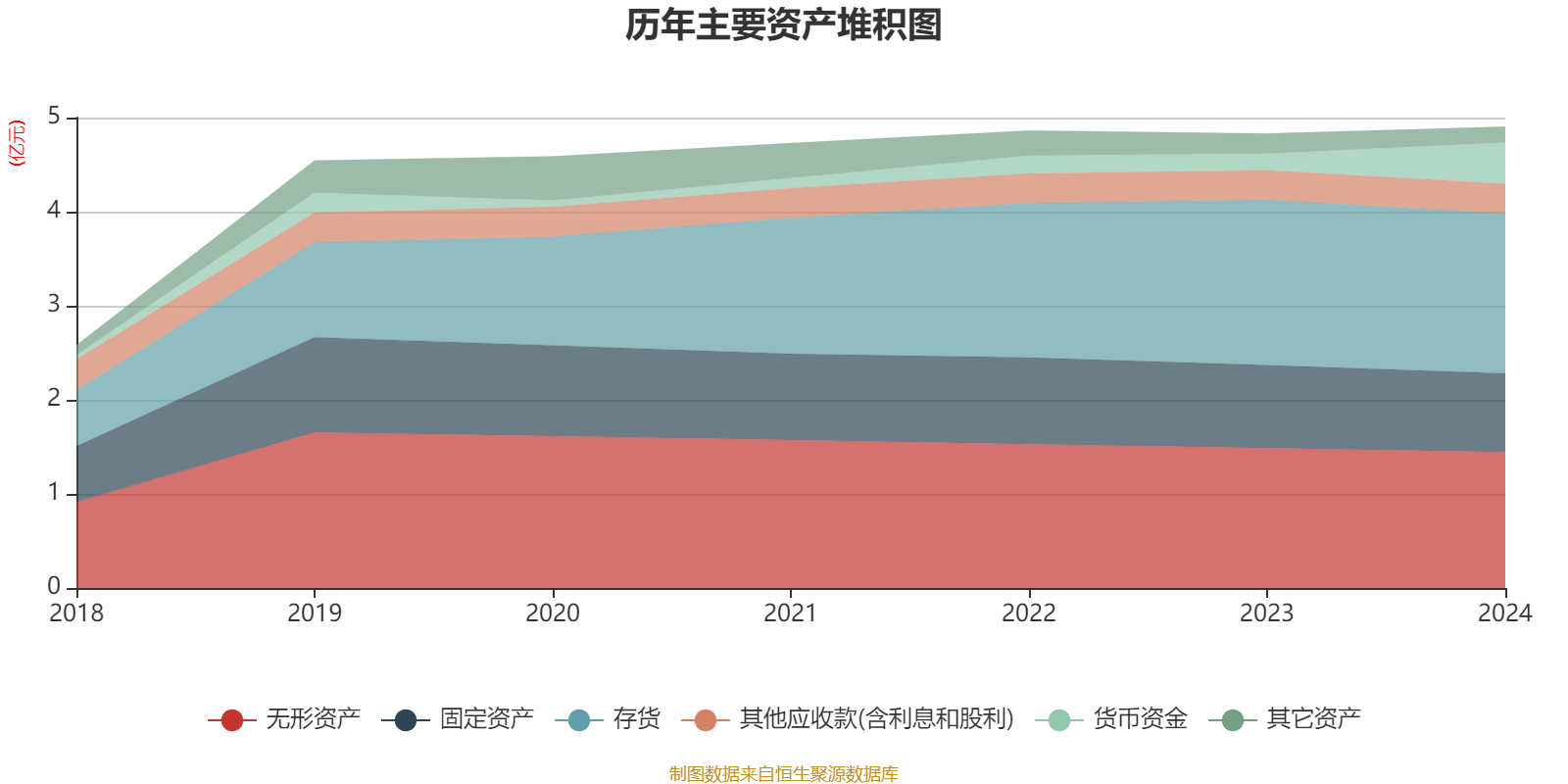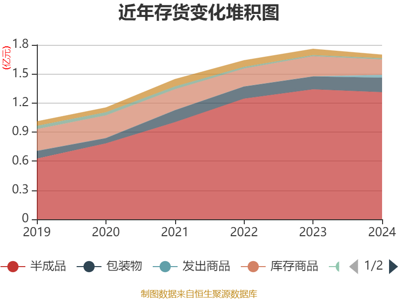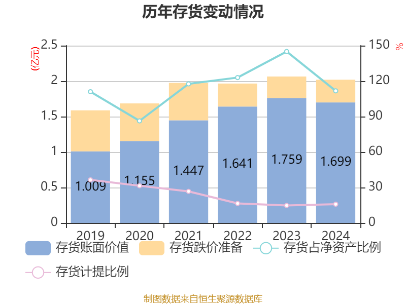 从存货变动来看,截至2024年末,公司存货账面价值为1.7亿元,占净资产的111.72%,较上年末减少602.51万元。其中,存货跌价准备为3202.45万元,计提比例为15.86%。