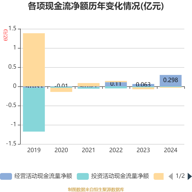 截至2024年,公司经营活动现金流净额为2984.36万元,同比增长375.06%;筹资活动现金流净额-211.43万元,同比增加286.86万元;投资活动现金流净额-159.24万元,上年同期为-235.12万元。