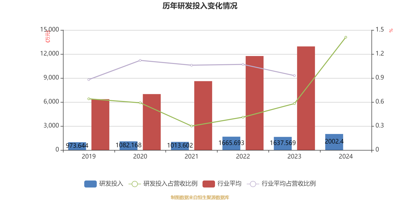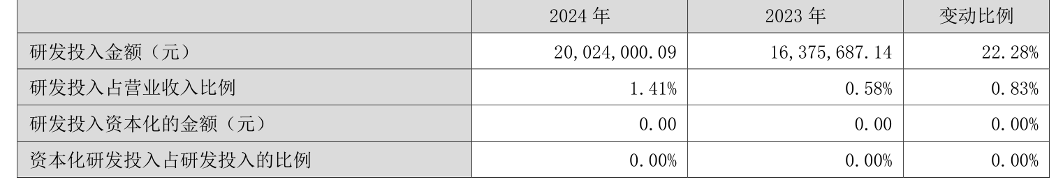 2024年全年,公司研发投入金额为2002.4万元,同比增长22.28%;研发投入占营业收入比例为1.41%,相比上年同期上升0.83个百分点。此外,公司全年研发投入资本化率为0%。
