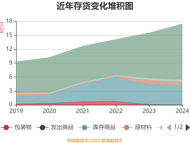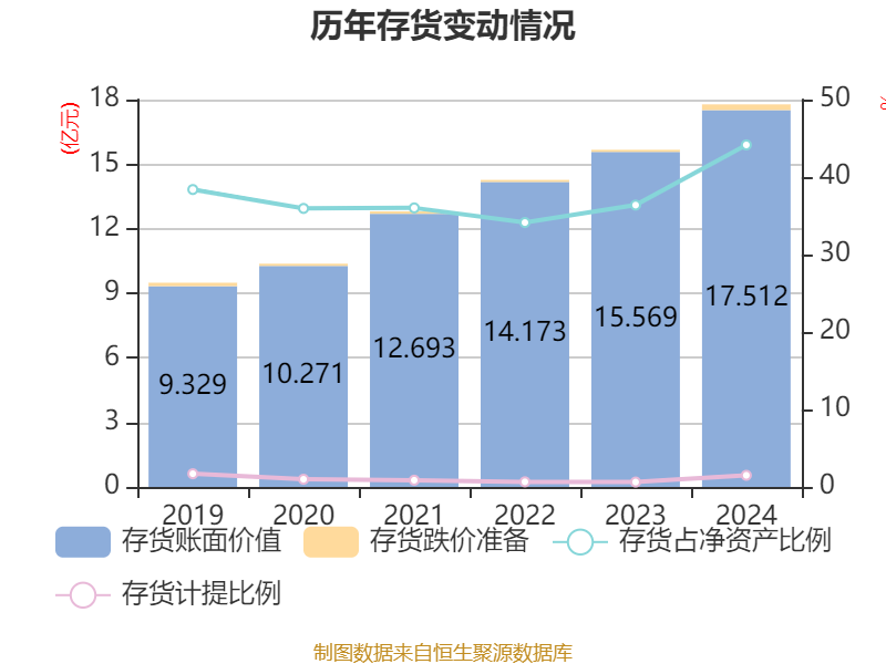 从存货变动来看,截至2024年末,公司存货账面价值为17.51亿元,占净资产的44.15%,较上年末增加1.94亿元。其中,存货跌价准备为2662.7万元,计提比例为1.5%。