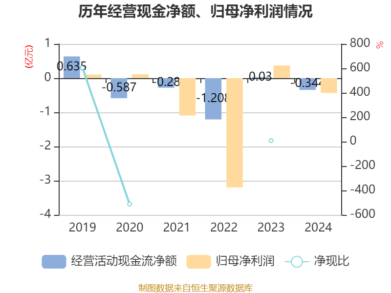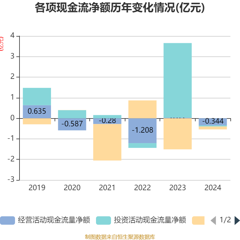 截至2024年,公司经营活动现金流净额为-3435.42万元,同比减少3737.18万元;筹资活动现金流净额-1407.3万元,同比增加1.37亿元;投资活动现金流净额-550.03万元,上年同期为3.63亿元。