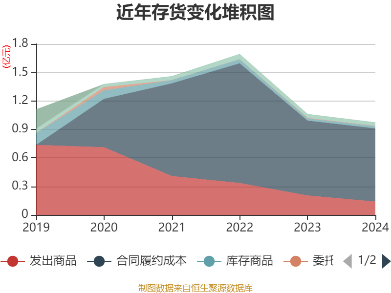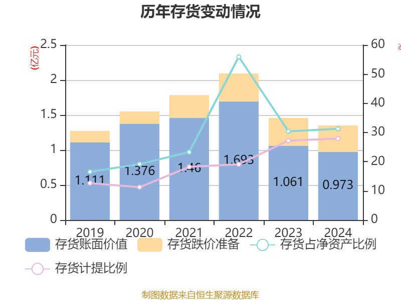 从存货变动来看,截至2024年末,公司存货账面价值为9731.52万元,占净资产的31.28%,较上年末减少877.95万元。其中,存货跌价准备为3769.67万元,计提比例为27.92%。