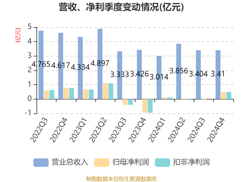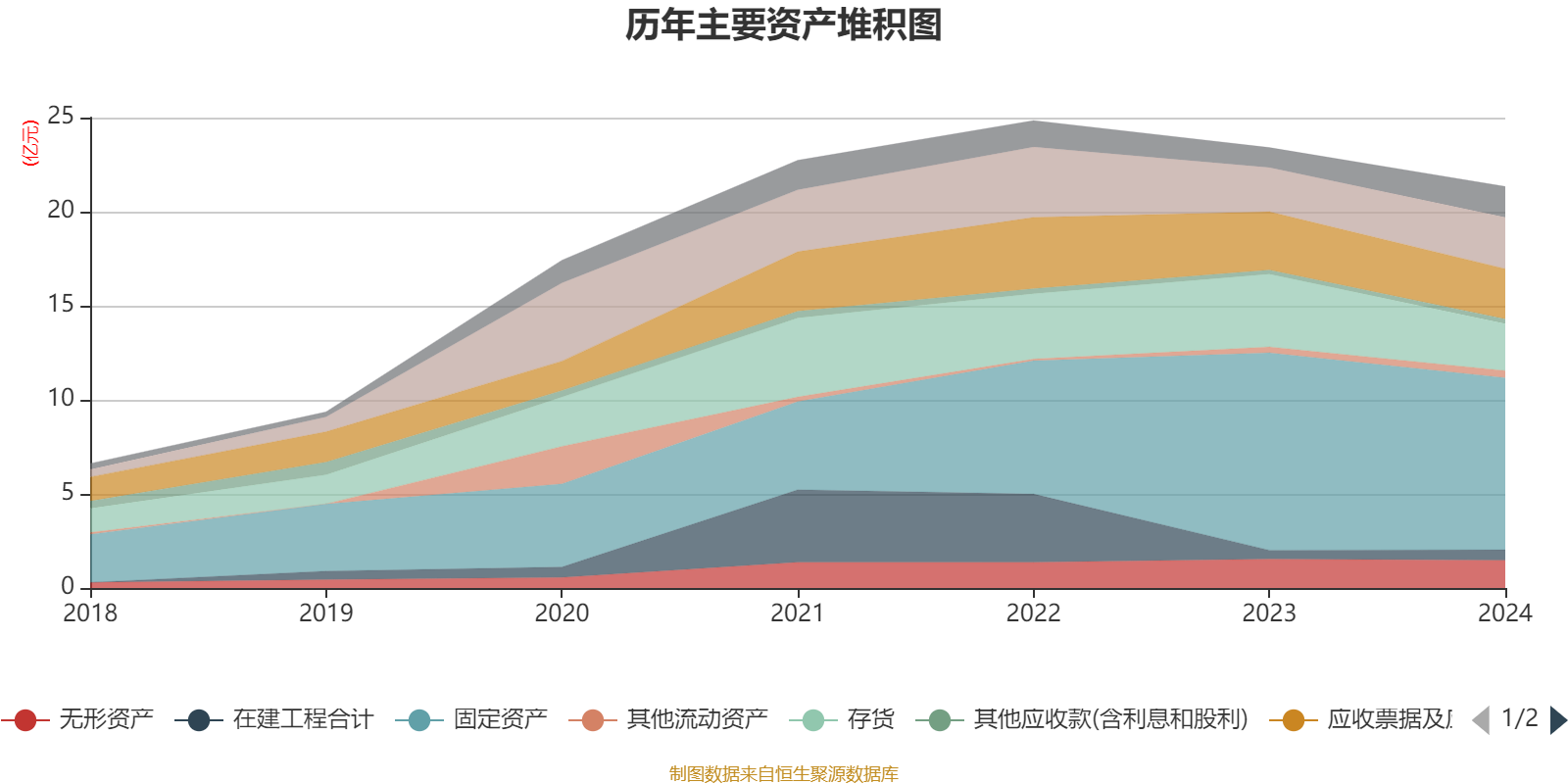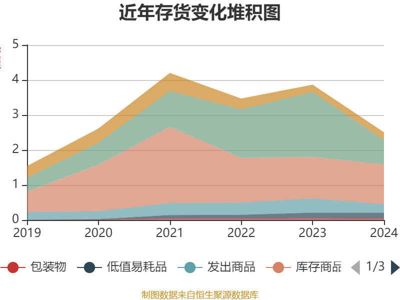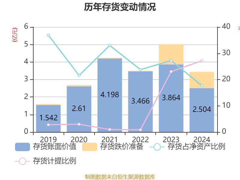 从存货变动来看,截至2024年末,公司存货账面价值为2.5亿元,占净资产的17.67%,较上年末减少1.36亿元。其中,存货跌价准备为9315.56万元,计提比例为27.12%。