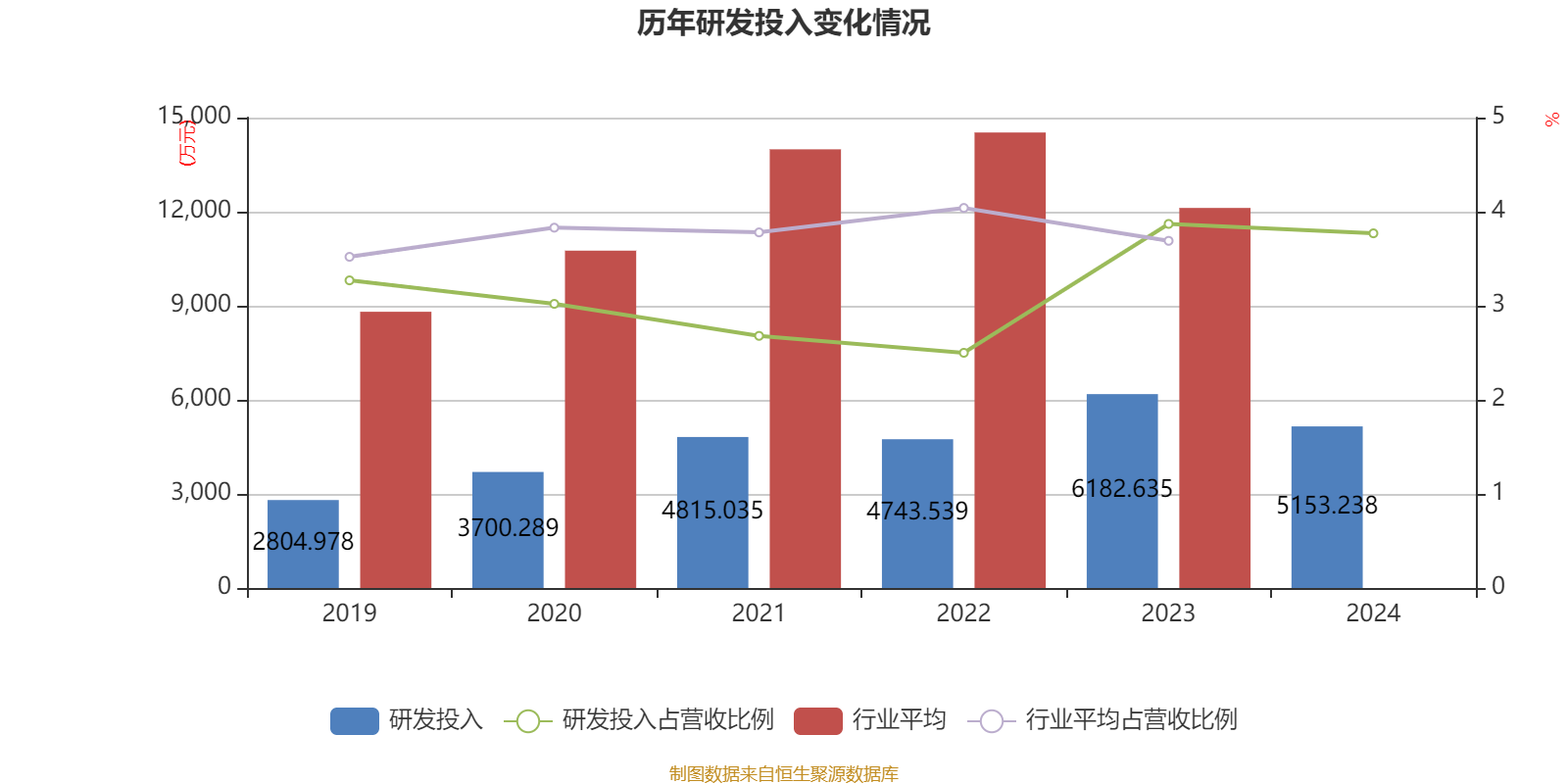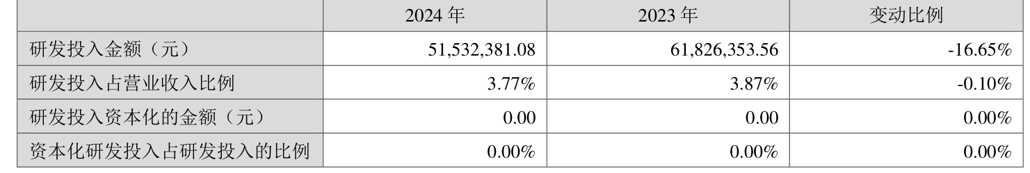 2024年全年,公司研发投入金额为5153.24万元,同比下降16.65%;研发投入占营业收入比例为3.77%,相比上年同期下降0.1个百分点。此外,公司全年研发投入资本化率为0%。