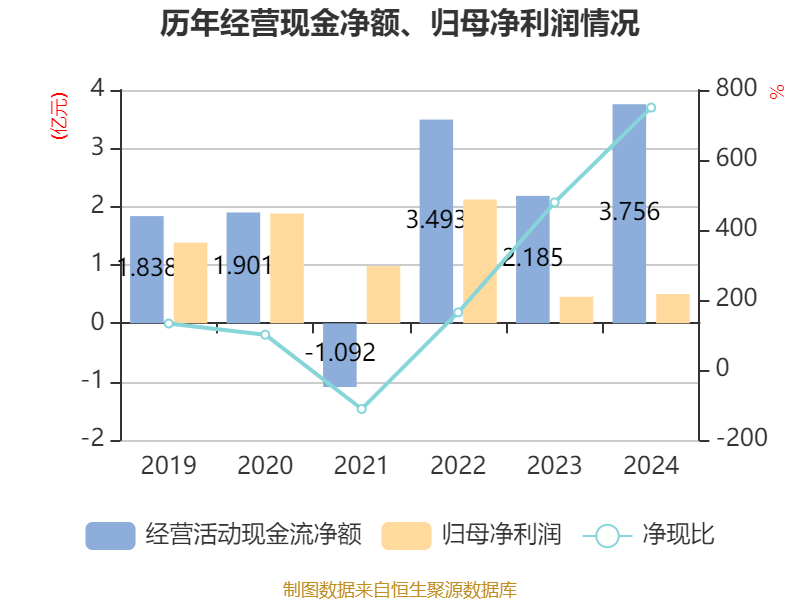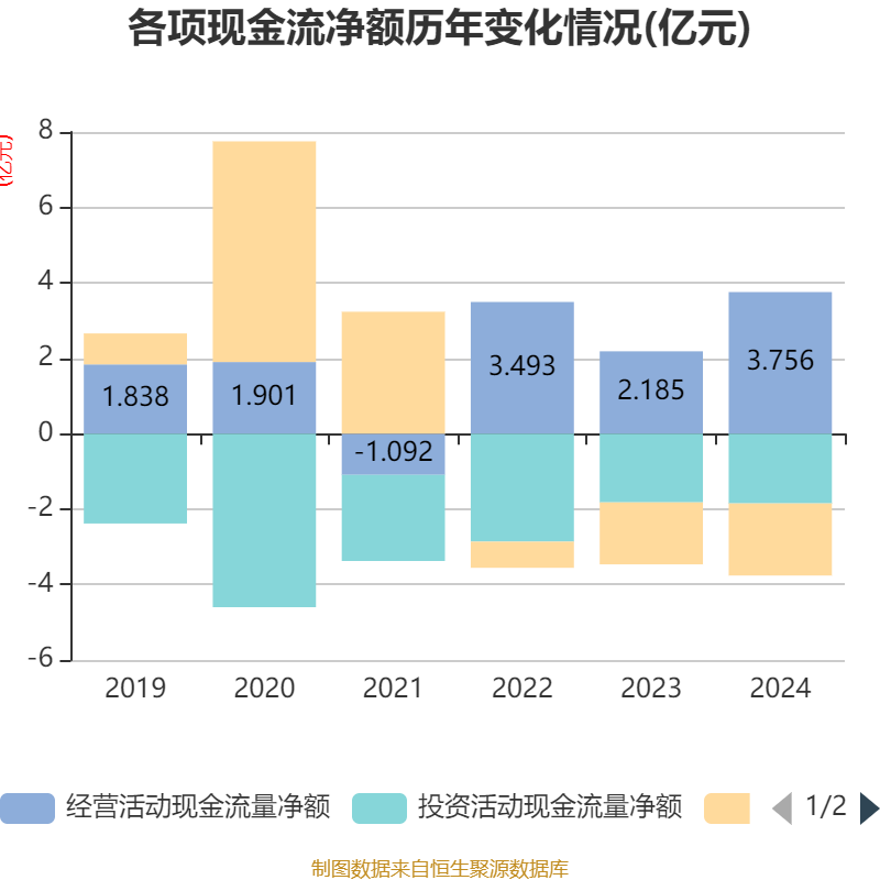 截至2024年,公司经营活动现金流净额为3.76亿元,同比增长71.93%;筹资活动现金流净额-1.91亿元,同比减少2692.05万元;投资活动现金流净额-1.85亿元,上年同期为-1.82亿元。