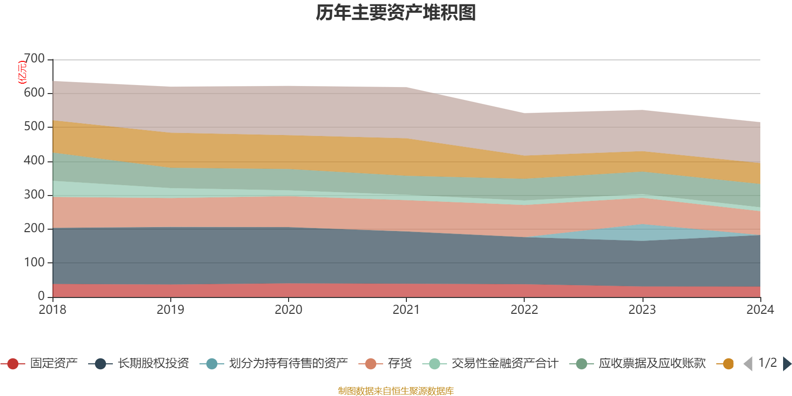 资产重大变化方面,截至2024年末,公司划分为持有待售的资产较上年末减少100%,占公司总资产比重下降9.01个百分点;长期股权投资较上年末增加13.1%,占公司总资产比重上升5.13个百分点;应收票据及应收账款较上年末增加3.3%,占公司总资产比重上升1.27个百分点;货币资金较上年末增加2.54%,占公司总资产比重上升1.06个百分点。