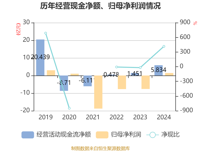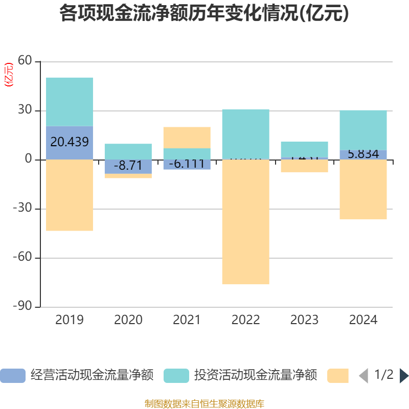 截至2024年,公司经营活动现金流净额为5.83亿元,同比增长302.03%;筹资活动现金流净额-36.54亿元,同比减少28.76亿元;投资活动现金流净额24.25亿元,上年同期为9.49亿元。