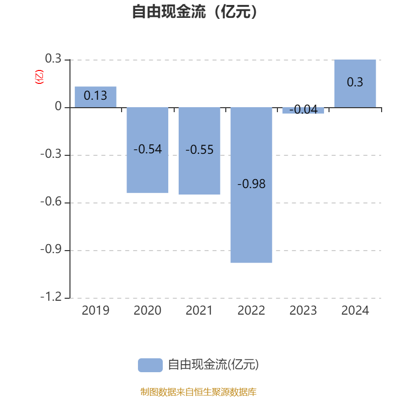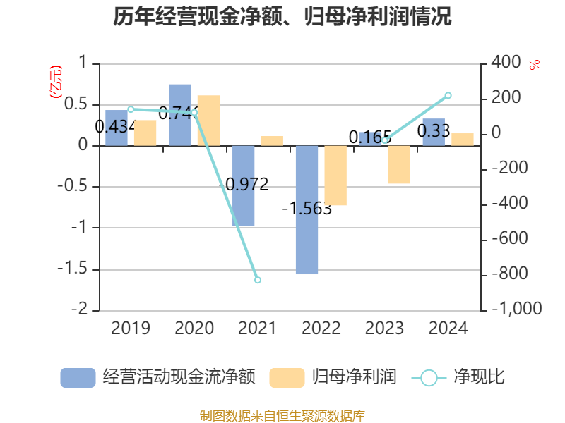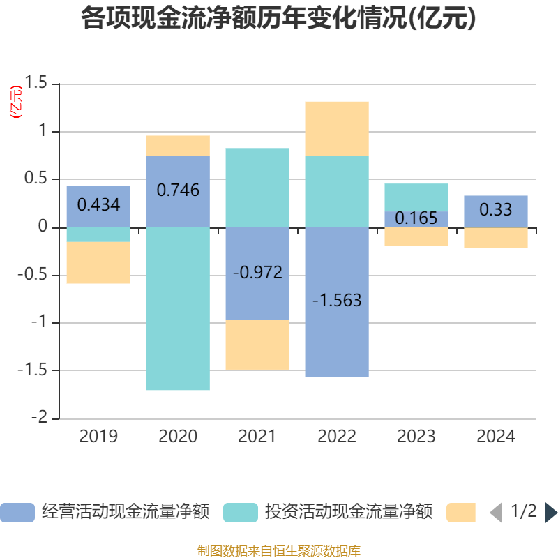 截至2024年,公司经营活动现金流净额为3299.55万元,同比增长99.44%;筹资活动现金流净额-2104.22万元,同比减少139.49万元;投资活动现金流净额-45.07万元,上年同期为2905.61万元。