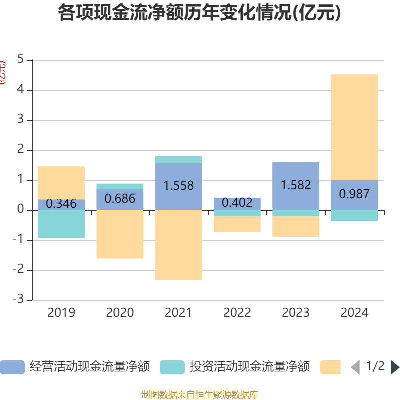 截至2024年,公司经营活动现金流净额为9866.62万元,同比下降37.64%;筹资活动现金流净额3.53亿元,同比增加4.22亿元;投资活动现金流净额-3780.59万元,上年同期为-2106.93万元。