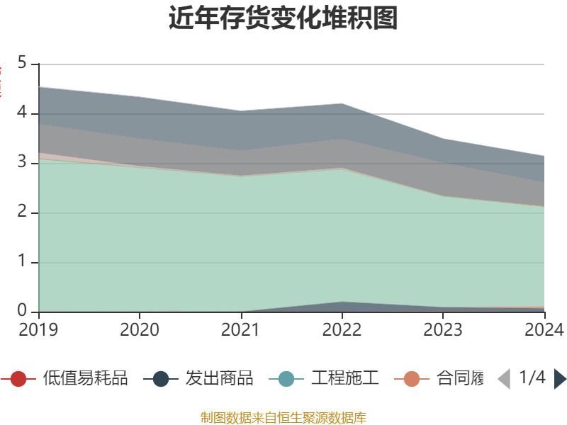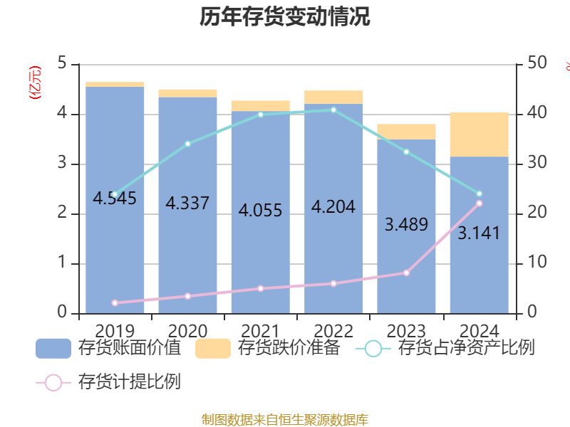 从存货变动来看,截至2024年末,公司存货账面价值为3.14亿元,占净资产的23.98%,较上年末减少3480.34万元。其中,存货跌价准备为8880.62万元,计提比例为22.04%。