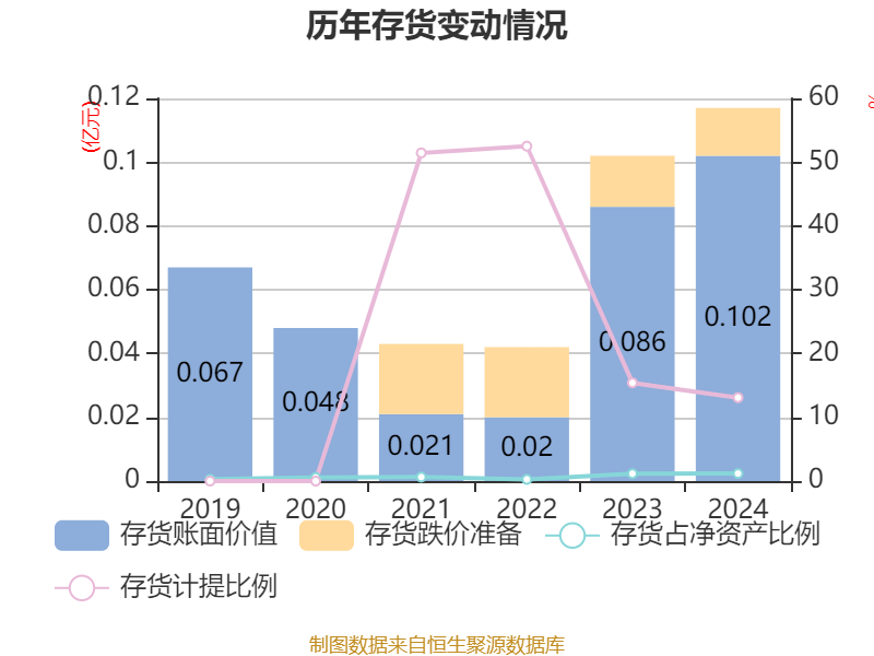 从存货变动来看,截至2024年末,公司存货账面价值为1015.45万元,占净资产的1.18%,较上年末增加150.57万元。其中,存货跌价准备为152.76万元,计提比例为13.08%。