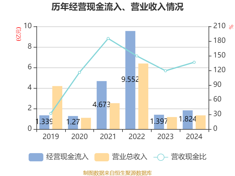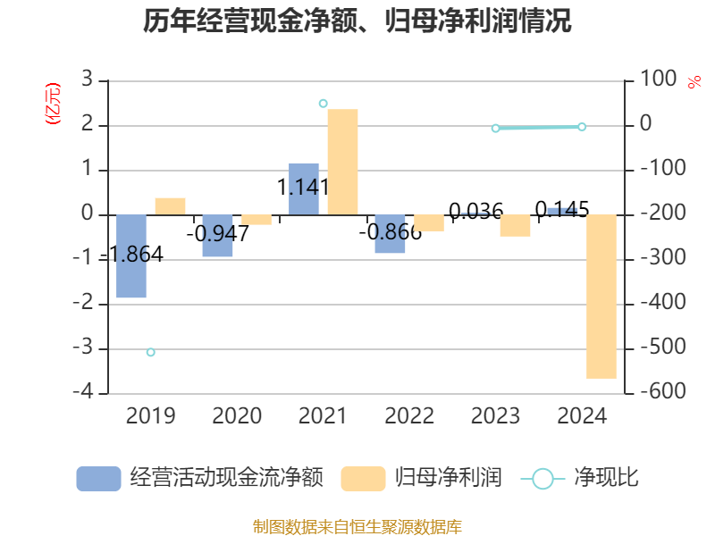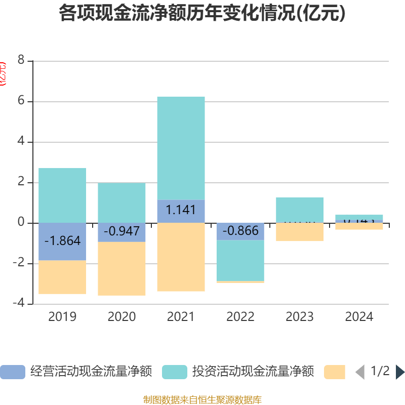 截至2024年,公司经营活动现金流净额为1451万元,同比增长301.76%;筹资活动现金流净额-3394.82万元,同比增加5625.43万元;投资活动现金流净额2532.19万元,上年同期为1.22亿元。