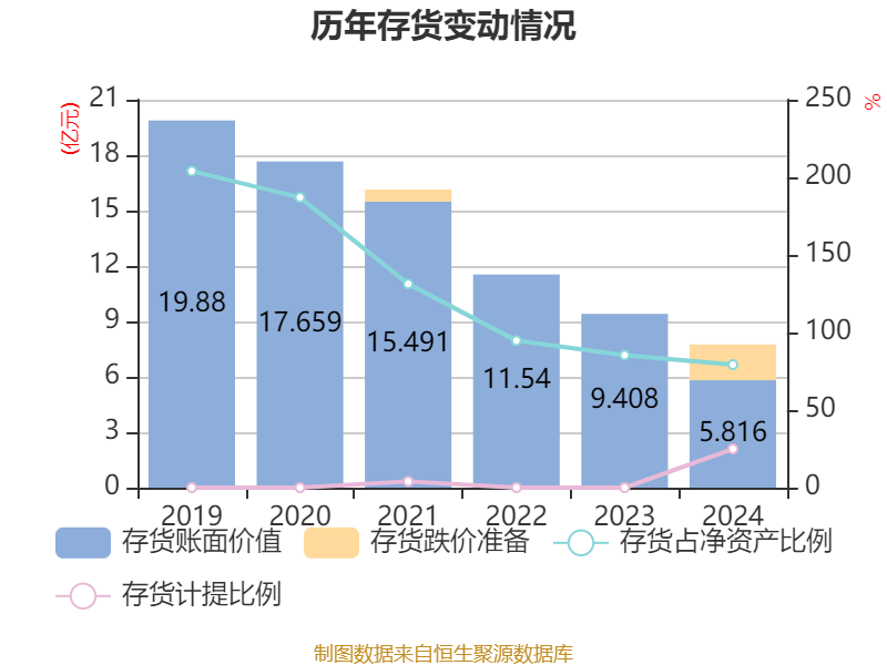 从存货变动来看,截至2024年末,公司存货账面价值为5.82亿元,占净资产的79.26%,较上年末减少3.59亿元。其中,存货跌价准备为1.94亿元,计提比例为24.97%。