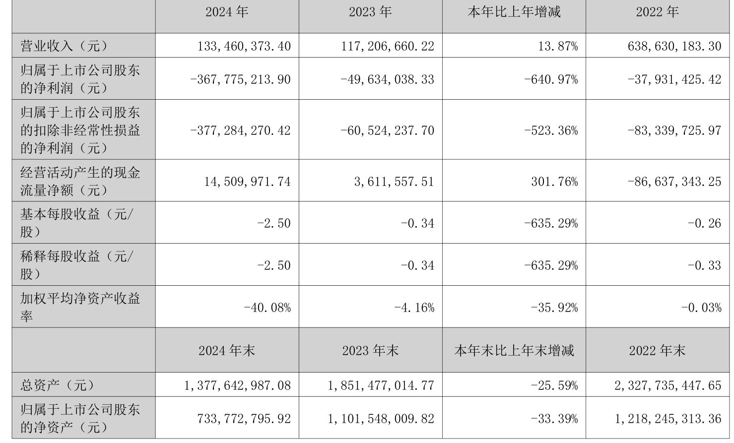 中证智能财讯荣丰控股(000668)4月29日披露2024年年度报告。2024年,公司实现营业总收入1.33亿元,同比增长13.87%;归母净利润亏损3.68亿元,上年同期亏损4963.4万元;扣非净利润亏损3.77亿元,上年同期亏损6052.42万元;经营活动产生的现金流量净额为1451万元,同比增长301.76%;报告期内,荣丰控股基本每股收益为-2.5元,加权平均净资产收益率为-40.08%。