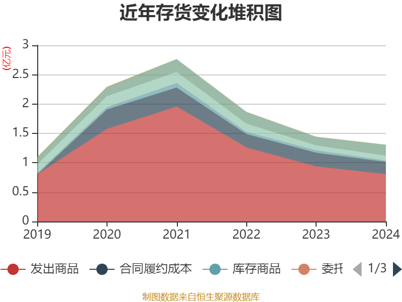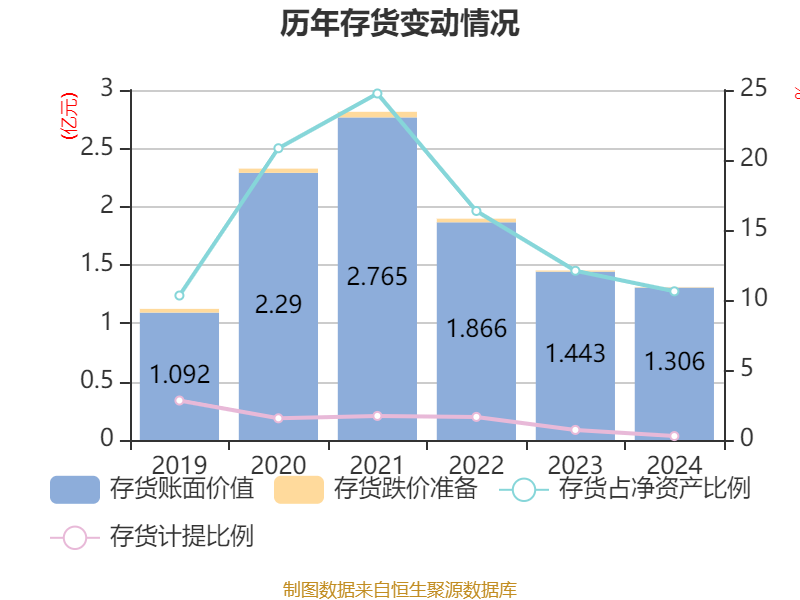 从存货变动来看,截至2024年末,公司存货账面价值为1.31亿元,占净资产的10.62%,较上年末减少1370.33万元。其中,存货跌价准备为36.53万元,计提比例为0.28%。